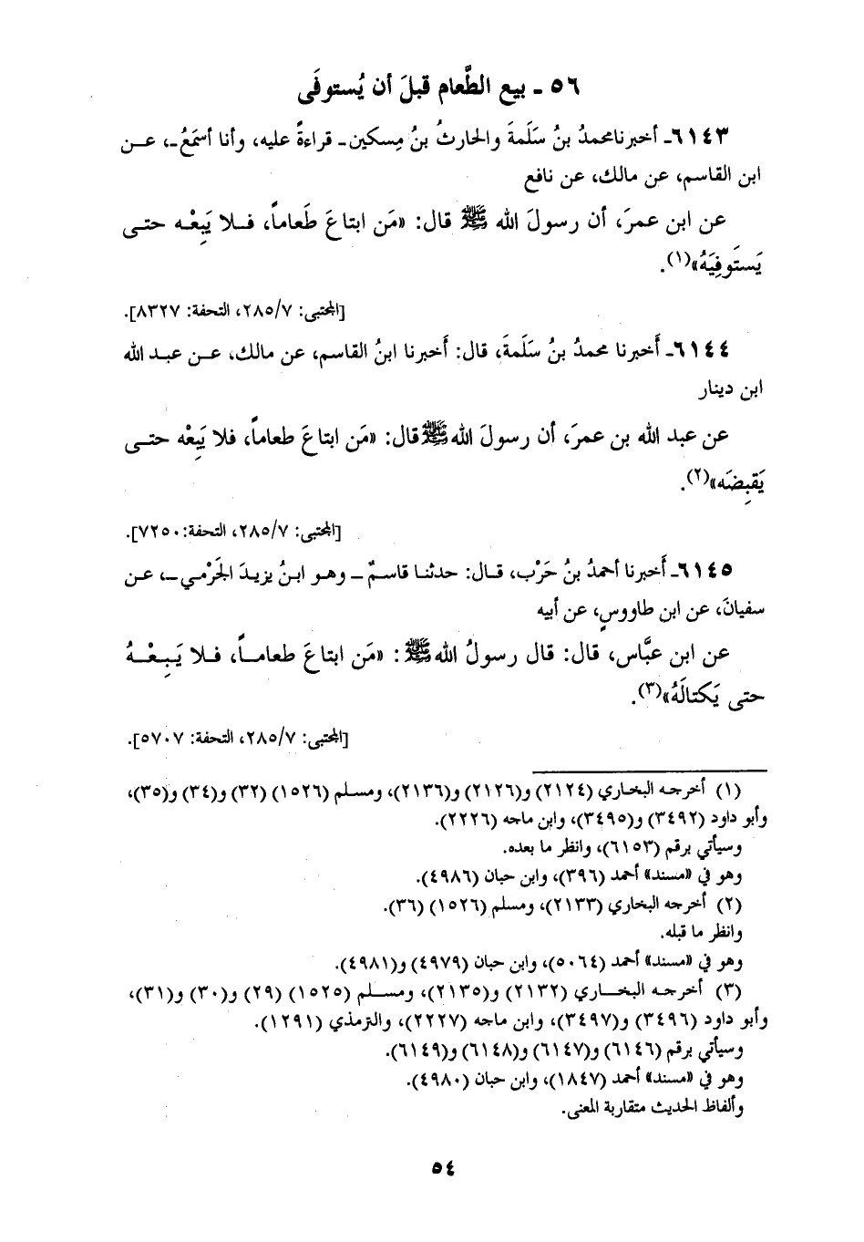 6143 - أَخْبَرَنَا مُحَمَّدُ بْنُ سَلَمَةَ، وَالْحَارِثُ بْنُ مِسْكِينٍ، قِرَاءَةً عَلَيْهِ، وَأَنَا أَسْمَعُ، عَنِ ابْنِ الْقَاسِمِ، عَنْ مَالِكٍ، عَنْ نَافِعٍ، عَنِ ابْنِ عُمَرَ، أَنَّ رَسُولَ اللهِ صَلَّى اللهُ عَلَيْهِ وَسَلَّمَ قَالَ: «§مَنِ ابْتَاعَ طَعَامًا فَلَا يَبِعْهُ حَتَّى يَسْتَوْفِيَهُ»