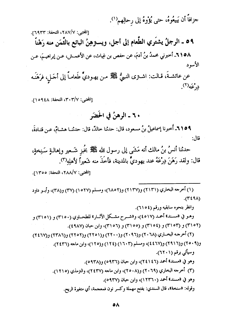 6158 - أَخْبَرَنِي مُحَمَّدُ بْنُ آدَمَ، عَنْ حَفْصِ بْنِ غِيَاثٍ، عَنِ الْأَعْمَشِ، عَنْ إِبْرَاهِيمَ، عَنِ الْأَسْوَدِ، عَنْ عَائِشَةَ، قَالَتِ: §اشْتَرَى النَّبِيُّ صَلَّى اللهُ عَلَيْهِ وَسَلَّمَ مِنْ يَهُودِيٍّ طَعَامًا إِلَى أَجَلٍ، فَرَهَنَهُ دِرْعَهُ