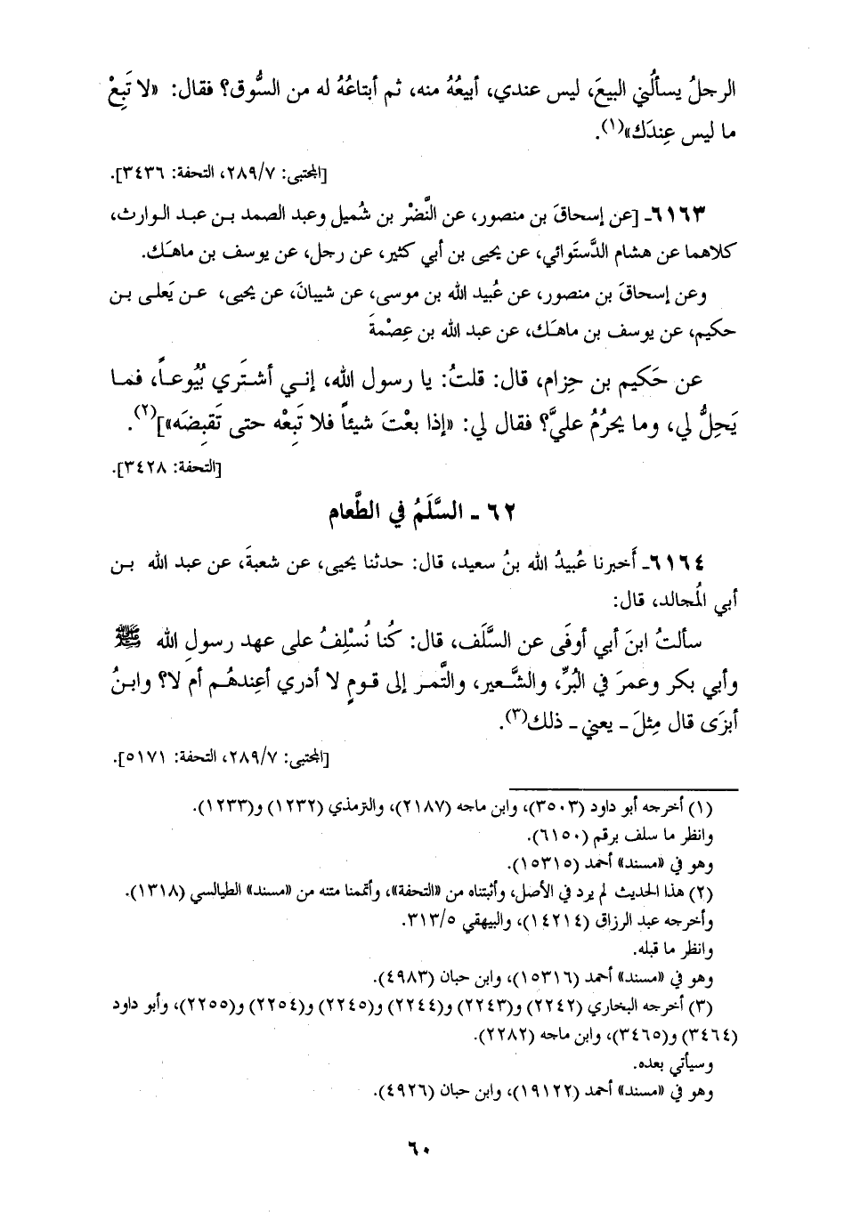 6163 - عَنْ إِسْحَاقَ بْنِ مَنْصُورٍ، عَنْ النَّضْرِ بْنِ شُمَيْلٍ، وَعَبْدِ الصَّمَدِ بْنِ عَبْدِ الْوَارِثِ، كِلَاهُمَا عَنْ هِشَامٍ الدَّسْتُوَائِيِّ، عَنْ يَحْيَى بْنِ أَبِي كَثِيرٍ، عَنْ رَجُلٍ، عَنْ يُوسُفَ بْنِ مَاهِكٍ، وَعَنْ إِسْحَاقَ بْنِ مَنْصُورٍ، عَنْ عُبَيْدِ اللهِ بْنُ مُوسَى، عَنْ شَيْبَانَ، عَنْ يَحْيَى، عَنْ يَعْلَى بْنَ حَكِيمٍ، عَنْ يُوسُفَ بْنِ مَاهِكٍ، عَنْ عَبْدِ اللهِ بْنِ عِصْمَةَ، عَنْ حَكِيمِ بْنِ حِزَامٍ، قَالَ: قُلْتُ: يَا رَسُولِ اللهِ، إِنِّي أَشْتَرِي بُيُوعًا، فَمَا يَحِلُّ لِي، وَمَا يَحْرُمُ عَلَيَّ؟ فَقَالَ لِي: «§إِذَا بِعْتَ شَيْئًا فَلَا تَبِعْهُ حَتَّى تَقْبِضَهُ»