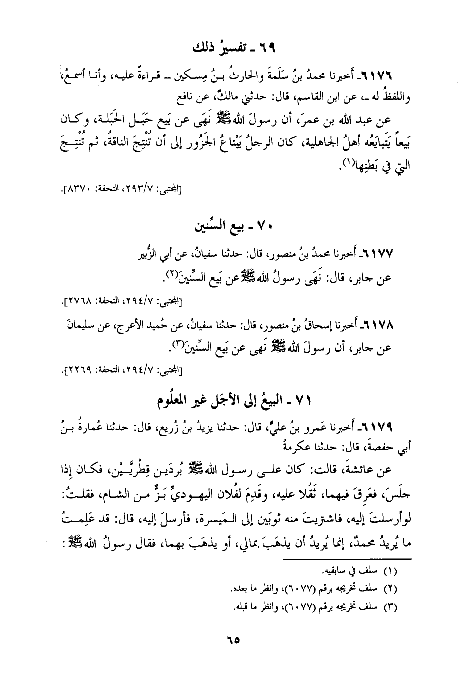6177 - أَخْبَرَنَا مُحَمَّدُ بْنُ مَنْصُورٍ، قَالَ: حَدَّثَنَا سُفْيَانُ، عَنْ أَبِي الزُّبَيْرِ، عَنْ جَابِرٍ، قَالَ: نَهَى الرَّسُولُ صَلَّى اللهُ عَلَيْهِ وَسَلَّمَ عَنْ §بَيْعِ السِّنِينَ