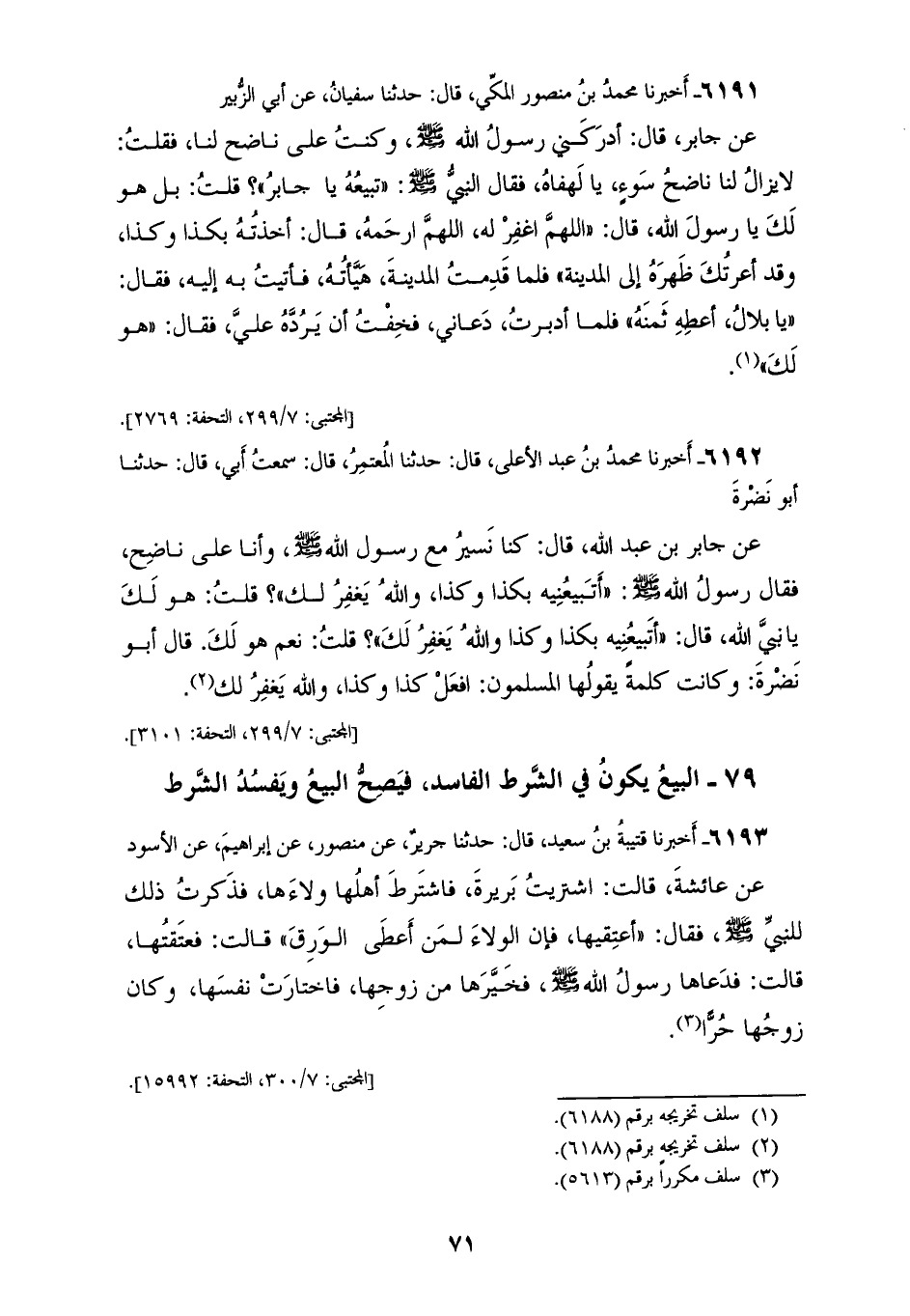 6191 - أَخْبَرَنَا مُحَمَّدُ بْنُ مَنْصُورٍ الْمَكِّيُّ، قَالَ: حَدَّثَنَا سُفْيَانُ، عَنْ أَبِي الزُّبَيْرِ، عَنْ جَابِرٍ، قَالَ: أَدْرَكَنِي رَسُولُ اللهِ صَلَّى اللهُ عَلَيْهِ وَسَلَّمَ وَكُنْتُ عَلَى نَاضِحٍ لَنَا، فَقُلْتُ: لَا يَزَالُ لَنَا نَاضِحُ سَوْءٍ، يَا لَهْفَاهُ، فَقَالَ النَّبِيُّ صَلَّى اللهُ عَلَيْهِ وَسَلَّمَ: «تَبِيعُهُ يَا جَابِرُ؟»، قُلْتُ: بَلْ هُوَ لَكَ، يَا رَسُولَ اللهِ، قَالَ: " §اللهُمَّ اغْفِرْ لَهُ، اللهُمَّ ارْحَمْهُ، قَالَ: أَخَذْتُهُ بِكَذَا وَكَذَا، وَقَدْ أَعَرْتُكَ ظَهْرَهُ إِلَى الْمَدِينَةِ «، فَلَمَّا قَدِمْتُ الْمَدِينَةَ هَيَّأْتُهُ، فَأَتَيْتُ بِهِ إِلَيْهِ، فَقَالَ»: يَا بِلَالُ، أَعْطِهِ ثَمَنَهُ «، فَلَمَّا أَدْبَرْتُ دَعَانِي، فَخِفْتُ أَنْ يَرُدَّهُ عَلَيَّ، فَقَالَ»: هُوَ لَكَ "