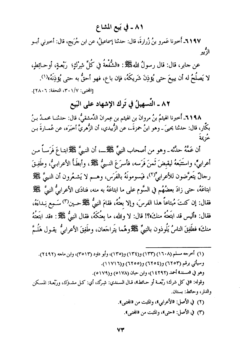 6198 - أَخْبَرَنَا الْهَيْثَمُ بْنُ مَرْوَانَ بْنِ الْهَيْثَمِ بْنِ عِمْرَانَ الدِّمَشْقِيُّ، قَالَ: حَدَّثَنَا مُحَمَّدُ بْنُ بَكَّارٍ، قَالَ: حَدَّثَنَا يَحْيَى وَهُوَ ابْنُ حَمْزَةَ، عَنِ الزُّبَيْدِيِّ، أَنَّ الزُّهْرِيَّ أَخْبَرَهُ، عَنْ عُمَارَةَ بْنِ خُزَيْمَةَ، أَنَّ عَمَّهُ حَدَّثَهُ، وَهُوَ مِنْ أَصْحَابِ النَّبِيِّ صَلَّى اللهُ عَلَيْهِ وَسَلَّمَ، أَنَّ النَّبِيَّ صَلَّى اللهُ عَلَيْهِ وَسَلَّمَ ابْتَاعَ فَرَسًا مِنْ أَعْرَابِيٍّ، وَاسْتَتْبَعَهُ لِيَقْبِضَ ثَمَنَ فَرَسِهِ، فَأَسْرَعَ النَّبِيُّ صَلَّى اللهُ عَلَيْهِ وَسَلَّمَ وَأَبْطَأَ الْأَعْرَابِيُّ، وَطَفِقَ رِجَالٌ يَتَعَرَّضُونَ لِلْأَعْرَابِيِّ فَيَسُومُونَهُ بِالْفَرَسِ، وَهُمْ لَا يَشْعُرُونَ أَنَّ النَّبِيَّ صَلَّى اللهُ عَلَيْهِ وَسَلَّمَ ابْتَاعَهُ، حَتَّى زَادَ بَعْضُهُمْ فِي السَّوْمِ عَلَى مَا ابْتَاعَهُ بِهِ مِنْهُ، فَنَادَى الْأَعْرَابِيُّ النَّبِيَّ صَلَّى اللهُ عَلَيْهِ وَسَلَّمَ، فَقَالَ: إِنْ كُنْتَ مُبْتَاعًا هَذَا الْفَرَسَ وَإِلَّا بِعْتُهُ، فَقَامَ النَّبِيُّ صَلَّى اللهُ عَلَيْهِ وَسَلَّمَ حِينَ سَمِعَ نِدَاءَهُ، فَقَالَ: «§أَلَيْسَ قَدِ ابْتَعْتُهُ مِنْكَ؟»، قَالَ: لَا، وَاللهِ مَا بِعْتُكَهُ، فَقَالَ النَّبِيُّ صَلَّى اللهُ عَلَيْهِ وَسَلَّمَ: «قَدِ ابْتَعْتُهُ مِنْكَ»، فَطَفِقَ النَّاسُ يَلُوذُونَ بِالنَّبِيِّ صَلَّى اللهُ عَلَيْهِ وَسَلَّمَ، وَهُمَا يَتَرَاجَعَانِ، وَطَفِقَ الْأَعْرَابِيُّ يَقُولُ: هَلُمَّ شَاهِدًا يَشْهَدُ أَنِّي قَدْ بِعْتُكَهُ، قَالَ خُزَيْمَةُ بْنُ ثَابِتٍ: أَنَا أَشْهَدُ أَنَّكَ قَدْ بِعْتَهُ، قَالَ: فَأَقْبَلَ النَّبِيُّ صَلَّى اللهُ عَلَيْهِ وَسَلَّمَ عَلَى خُزَيْمَةَ، فَقَالَ: «بِمَ تَشْهَدُ؟»، قَالَ: بِتَصْدِيقِكَ يَا رَسُولَ اللهِ، قَالَ: فَجَعَلَ رَسُولُ اللهِ صَلَّى اللهُ عَلَيْهِ وَسَلَّمَ شَهَادَةَ خُزَيْمَةَ بِشَهَادَةِ رَجُلَيْنِ