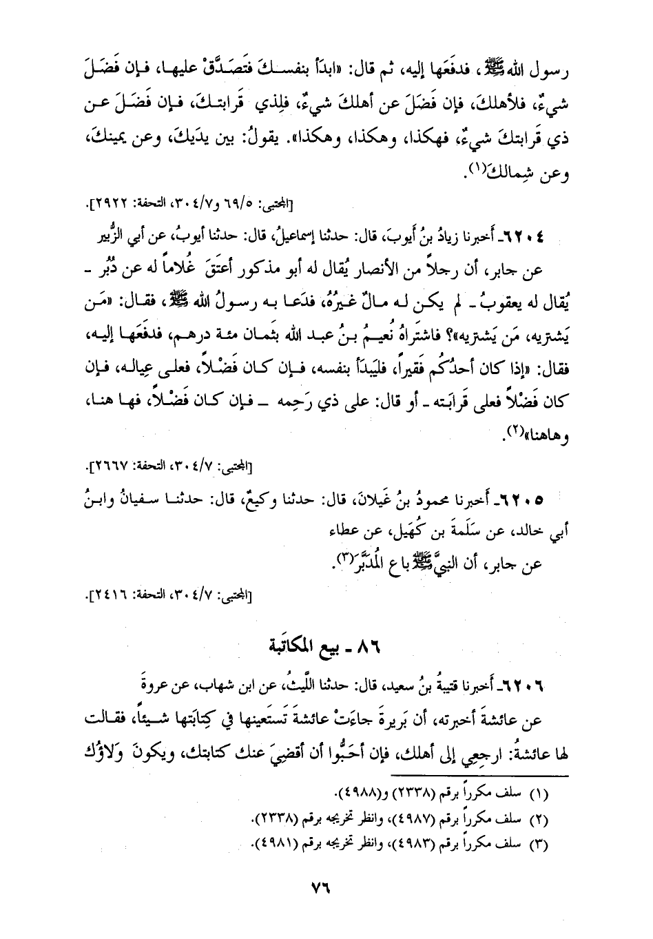 6204 - أَخْبَرَنَا زِيَادُ بْنُ أَيُّوبَ، قَالَ: حَدَّثَنَا إِسْمَاعِيلُ، قَالَ: حَدَّثَنَا أَيُّوبُ، عَنْ أَبِي الزُّبَيْرِ، عَنْ جَابِرٍ، أَنَّ رَجُلًا مِنَ الْأَنْصَارِ يُقَالُ لَهُ أَبُو مَذْكُورٍ أَعْتَقَ غُلَامًا لَهُ عَنْ دُبُرٍ، يُقَالُ لَهُ يَعْقُوبُ، لَمْ يَكُنْ لَهُ مَالٌ غَيْرَهُ، فَدَعَا بِهِ رَسُولُ اللهِ صَلَّى اللهُ عَلَيْهِ وَسَلَّمَ، فَقَالَ ": مَنْ يَشْتَرِيهِ؟، مَنْ يَشْتَرِيهِ؟ "، فَاشْتَرَاهُ نُعَيْمُ بْنُ عَبْدِ اللهِ بِثَمَانِمِائَةِ دِرْهَمٍ، فَدَفَعَهَا إِلَيْهِ، فَقَالَ: «§إِذَا كَانَ أَحَدُكُمْ فَقِيرًا فَلْيَبْدَأْ بِنَفْسِهِ، فَإِنْ كَانَ فَضْلًا فَعَلَى عِيَالِهِ، فَإِنْ كَانَ فَضْلًا فَعَلَى قَرَابَتِهِ»، أَوْ قَالَ: " عَلَى ذِي رَحِمِهِ، فَإِنْ كَانَ فَضْلًا فَهَاهُنَا وَهَاهُنَا