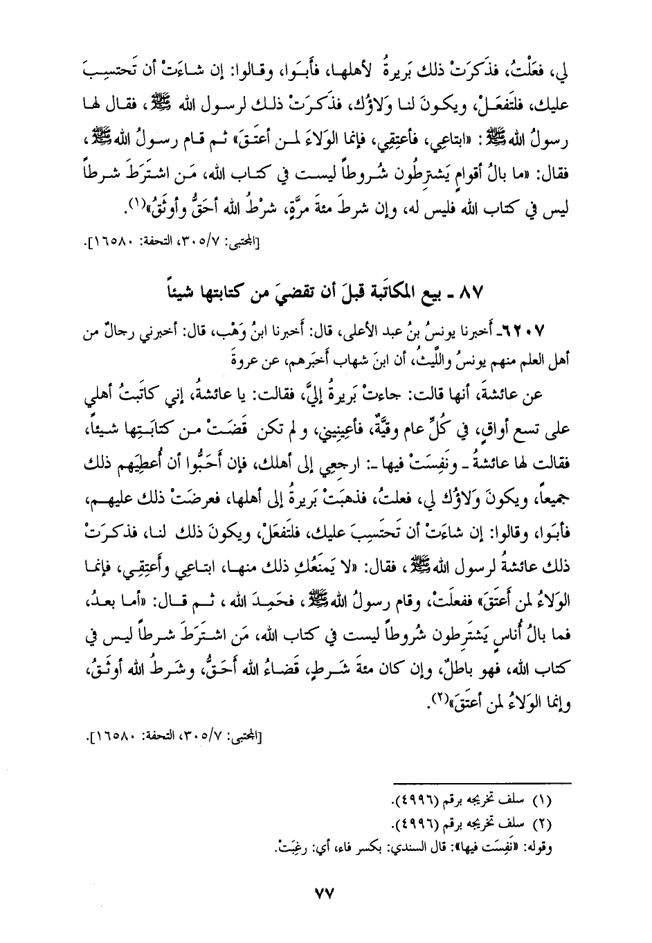 6207 - أَخْبَرَنَا يُونُسُ بْنُ عَبْدِ الْأَعْلَى، قَالَ: أَخْبَرَنَا ابْنُ وَهْبٍ، قَالَ: أَخْبَرَنِي رِجَالٌ، مِنْ أَهْلِ الْعِلْمِ، مِنْهُمْ يُونُسُ , وَاللَّيْثُ، أَنَّ ابْنَ شِهَابٍ أَخْبَرَهُمْ، عَنْ عُرْوَةَ، عَنْ عَائِشَةَ، أَنَّهَا قَالَتْ: جَاءَتْ بَرِيرَةُ إِلَيَّ، فَقَالَتْ: يَا عَائِشَةُ، إِنِّي كَاتَبْتُ أَهْلِي عَلَى تِسْعِ أَوَاقٍ فِي كُلِّ عَامٍ وُقِيَّةٌ، فَأَعِينِينِي، وَلَمْ تَكُنْ قَضَتْ مِنْ كِتَابَتِهَا شَيْئًا، فَقَالَتْ لَهَا عَائِشَةُ، وَنَفِسَتْ فِيهَا، ارْجِعِي إِلَى أَهْلِكِ، فَإِنْ أَحَبُّوا أَنْ أُعْطِيَهُمْ ذَلِكَ جَمِيعًا وَيَكُونَ وَلَاؤُكِ لِي فَعَلْتُ، فَذَهَبَتْ بَرِيرَةُ إِلَى أَهْلِهَا، فَعَرَضَتْ ذَلِكَ عَلَيْهِمْ، فَأَبَوْا وَقَالُوا: إِنْ شَاءَتْ أَنْ تَحْتَسِبَ عَلَيْكِ فَلْتَفْعَلْ وَيَكُونَ ذَلِكَ لَنَا، فَذَكَرَتْ ذَلِكَ عَائِشَةُ لِرَسُولِ اللهِ صَلَّى اللهُ عَلَيْهِ وَسَلَّمَ، فَقَالَ: «لَا يَمْنَعُكِ ذَلِكَ مِنْهَا، ابْتَاعِي وَأَعْتِقِي؛ فَإِنّمَا الْوَلَاءُ لِمَنْ أَعْتَقَ»، فَفَعَلَتْ، وَقَامَ رَسُولُ اللهِ صَلَّى اللهُ عَلَيْهِ وَسَلَّمَ، فَحَمِدَ اللهَ، ثُمَّ قَالَ: «أَمَّا بَعْدُ، §فَمَا بَالُ أُنَاسٍ يَشْتَرِطُونَ شُرُوطًا لَيْسَتْ فِي كِتَابِ اللهِ، مَنِ اشْتَرَطَ شَرْطًا لَيْسَ فِي كِتَابِ اللهِ فَهُوَ بَاطِلٌ، وَإِنْ كَانَ مِائَةُ شَرْطٍ، قَضَاءُ اللهِ أَحَقُّ، وَشَرْطُ اللهِ أَوْثَقُ، وَإِنَّمَا الْوَلَاءُ لِمَنْ أَعْتَقَ»