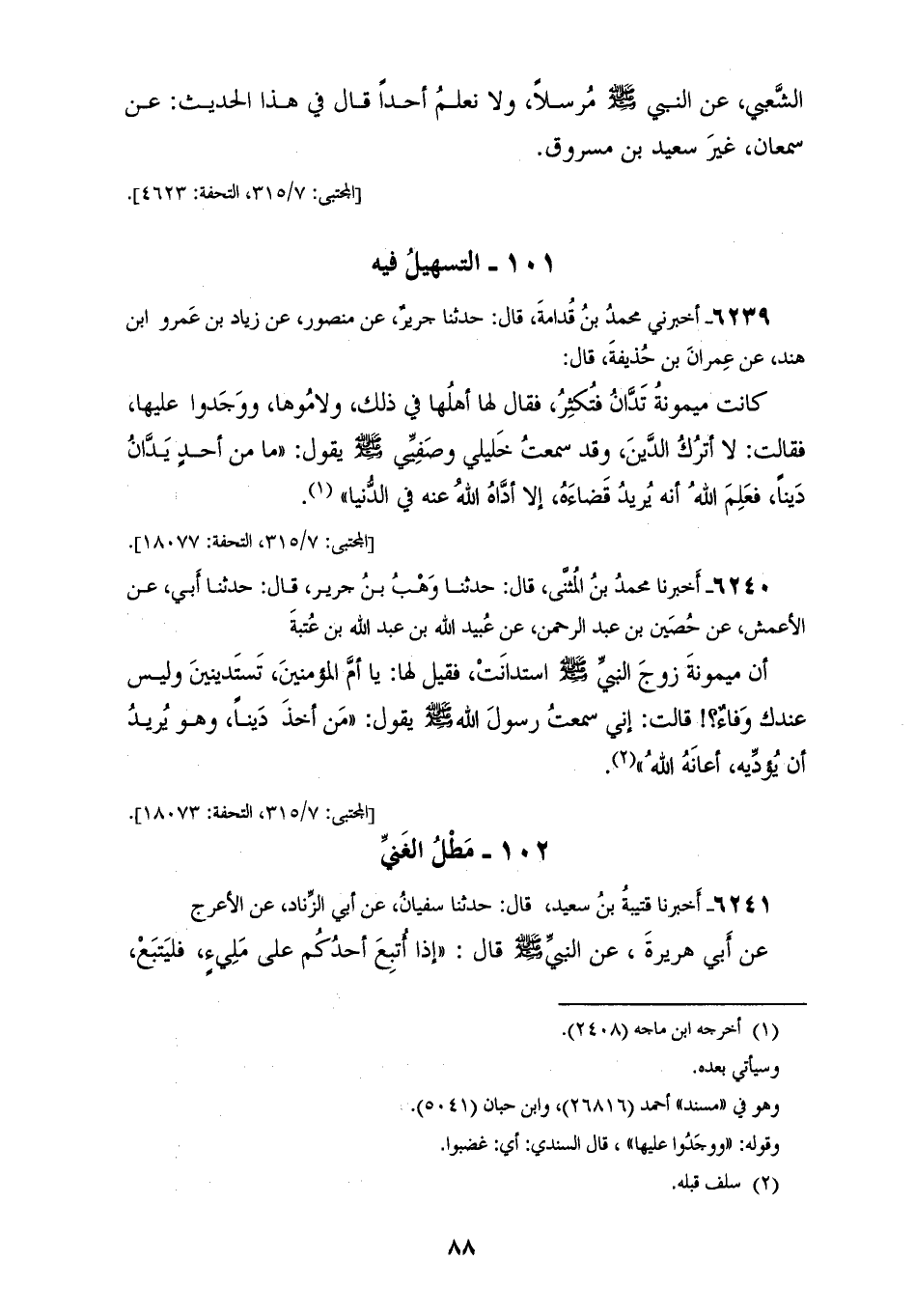 6239 - أَخْبَرَنِي مُحَمَّدُ بْنُ قُدَامَةَ، قَالَ: حَدَّثَنَا جَرِيرٌ، عَنْ مَنْصُورٍ، عَنْ زِيَادِ بْنِ عَمْرِو بْنِ هِنْدٍ، عَنْ عِمْرَانَ بْنِ حُذَيْفَةَ، قَالَ: كَانَتْ مَيْمُونَةُ تَدَّانُ فَتُكْثِرُ، فَقَالَ لَهَا أَهْلُهَا فِي ذَلِكَ، وَلَامُوهَا، وَوَجَدُوا عَلَيْهَا، فَقَالَتْ: لَا أَتْرُكُ الدَّيْنَ، وَقَدْ سَمِعْتُ خَلِيلِي وَصَفِيِّي صَلَّى اللهُ عَلَيْهِ وَسَلَّمَ يَقُولُ: «§مَا مِنْ أَحَدٍ يَدَّانُ دَيْنًا، فَعَلِمَ اللهُ أَنَّهُ يُرِيدُ قَضَاءَهُ، إِلَّا أَدَّاهُ اللهُ عَنْهُ فِي الدُّنْيَا»