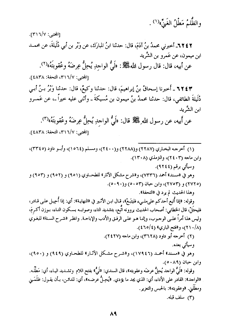 6242 - أَخْبَرَنِي مُحَمَّدُ بْنُ آدَمَ، قَالَ: حَدَّثَنَا ابْنُ الْمُبَارَكِ، عَنْ وَبْرِ بْنِ أَبِي دُلَيْلَةَ، عَنْ مُحَمَّدِ بْنِ مَيْمُونٍ، عَنْ عَمْرِو بْنِ الشَّرِيدِ، عَنْ أَبِيهِ، قَالَ: قَالَ رَسُولُ اللهِ صَلَّى اللهُ عَلَيْهِ وَسَلَّمَ: " §لَيُّ الْوَاجِدِ يُحِلُّ عِرْضَهُ وَعُقُوبَتَهُ
