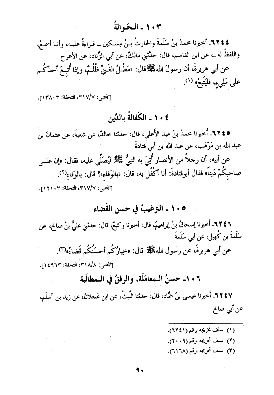 6245 - أَخْبَرَنَا مُحَمَّدُ بْنُ عَبْدِ الْأَعْلَى، قَالَ: حَدَّثَنَا خَالِدٌ، عَنْ شُعْبَةَ، عَنْ عُثْمَانَ بْنِ عَبْدِ اللهِ بْنِ مَوْهَبٍ، عَنْ عَبْدِ اللهِ بْنِ أَبِي قَتَادَةَ، عَنْ أَبِيهِ، أَنَّ رَجُلًا، مِنَ الْأَنْصَارِ أُتِيَ بِهِ النَّبِيُّ صَلَّى اللهُ عَلَيْهِ وَسَلَّمَ؛ لَيُصَلِّي عَلَيْهِ، فَقَالَ: إِنَّ «§عَلَى صَاحِبِكُمْ دِينًا» فَقَالَ أَبُو قَتَادَةَ: أَنَا أَكْفُلُ بِهِ، قَالَ: «بِالْوَفَاءِ؟»، قَالَ: بِالْوَفَاءِ