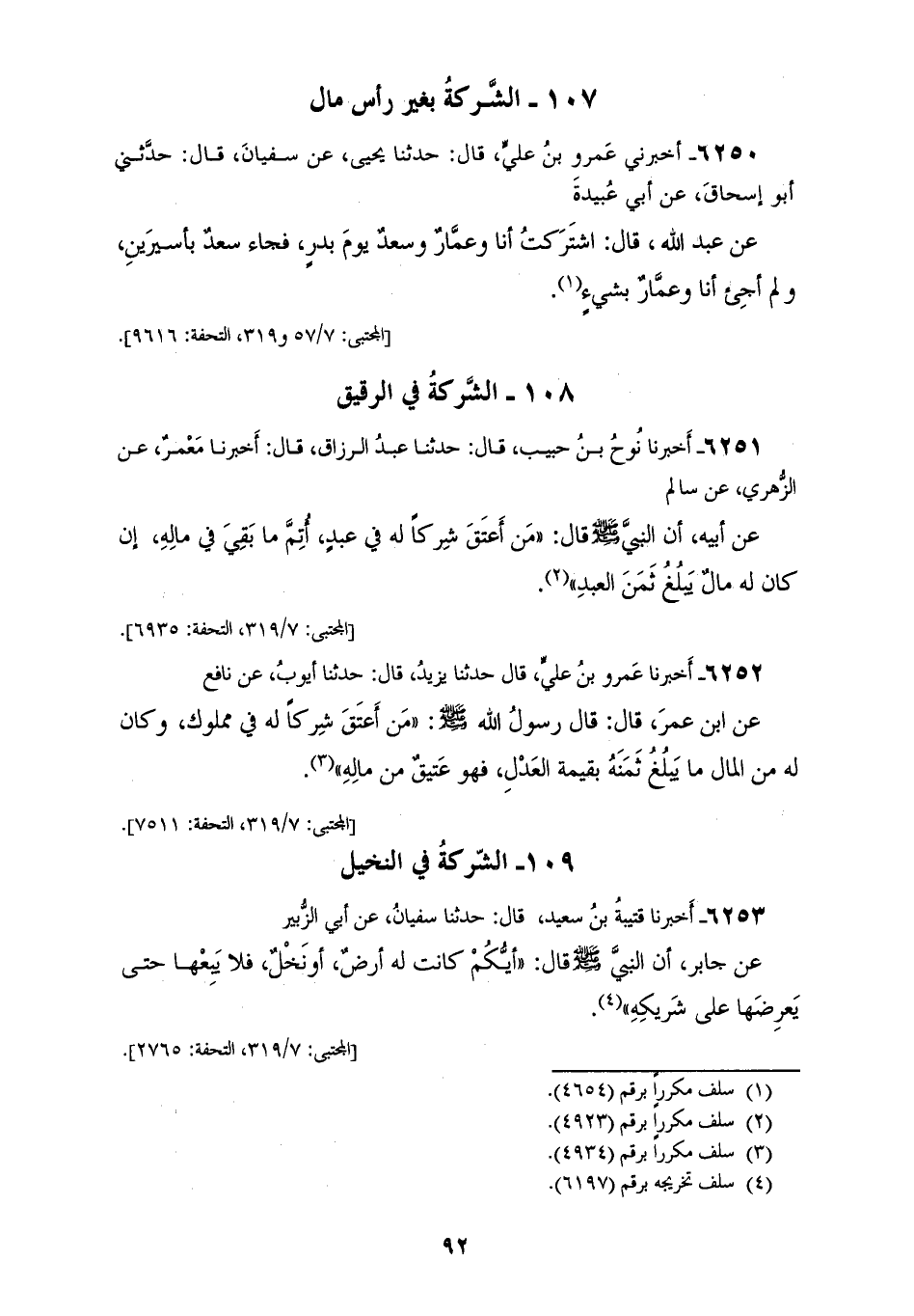 6253 - أَخْبَرَنَا قُتَيْبَةُ بْنُ سَعِيدٍ، قَالَ: حَدَّثَنَا سُفْيَانُ، عَنْ أَبِي الزُّبَيْرِ، عَنْ جَابِرٍ، أَنَّ النَّبِيَّ صَلَّى اللهُ عَلَيْهِ وَسَلَّمَ قَالَ: «§أَيُّكُمْ كَانَتْ لَهُ أَرْضٌ أَوْ نَخْلٌ فَلَا يَبِعْهَا حَتَّى يَعْرِضَهَا عَلَى شَرِيكِهِ»