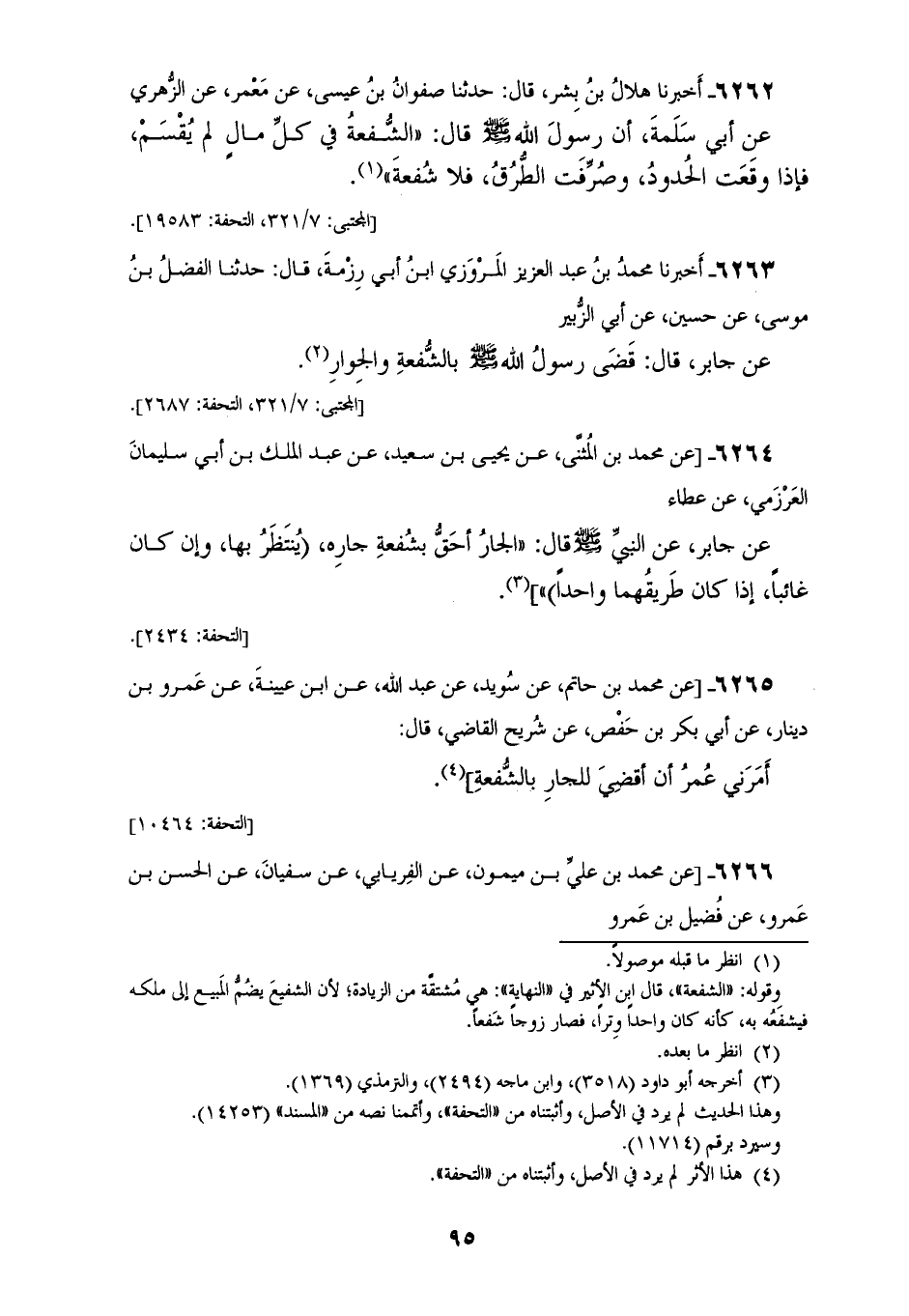 6265 - عَنْ مُحَمَّدِ بْنِ حَاتِمٍ، عَنْ سُوَيْدٍ، عَنْ عَبْدِ اللهِ، عَنِ ابْنِ عُيَيْنَةَ، عَنْ عَمْرِو بْنِ دِينَارٍ، عَنْ أَبِي بَكْرِ بْنِ حَفْصٍ، عَنْ شُرَيْحٍ الْقَاضِي، قَالَ: أَمَرَنِي عُمَرُ أَنْ §أَقْضِيَ لِلْجَارِ بِالشُّفْعَةِ "