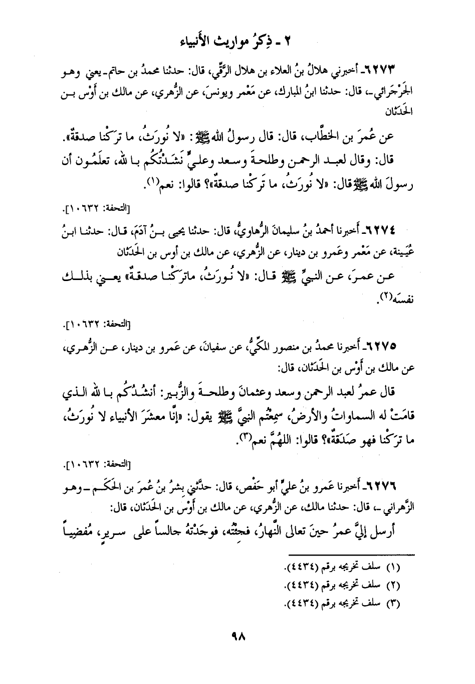 6274 - أَخْبَرَنَا أَحْمَدُ بْنُ سُلَيْمَانَ الرُّهَاوِيُّ، قَالَ: حَدَّثَنَا يَحْيَى بْنُ آدَمَ، قَالَ: حَدَّثَنَا ابْنُ عُيَيْنَةَ، عَنْ مَعْمَرٍ، وَعَمْرِو بْنِ دِينَارٍ، عَنِ الزُّهْرِيِّ، عَنْ مَالِكِ بْنِ أَوْسِ بْنِ الْحَدَثَانِ، عَنْ عُمَرَ، عَنِ النَّبِيِّ صَلَّى اللهُ عَلَيْهِ وَسَلَّمَ، قَالَ: «§لَا نُورَثُ، مَا تَرَكْنَا صَدَقَةٌ» يَعْنِي بِذَلِكَ نَفْسَهُ