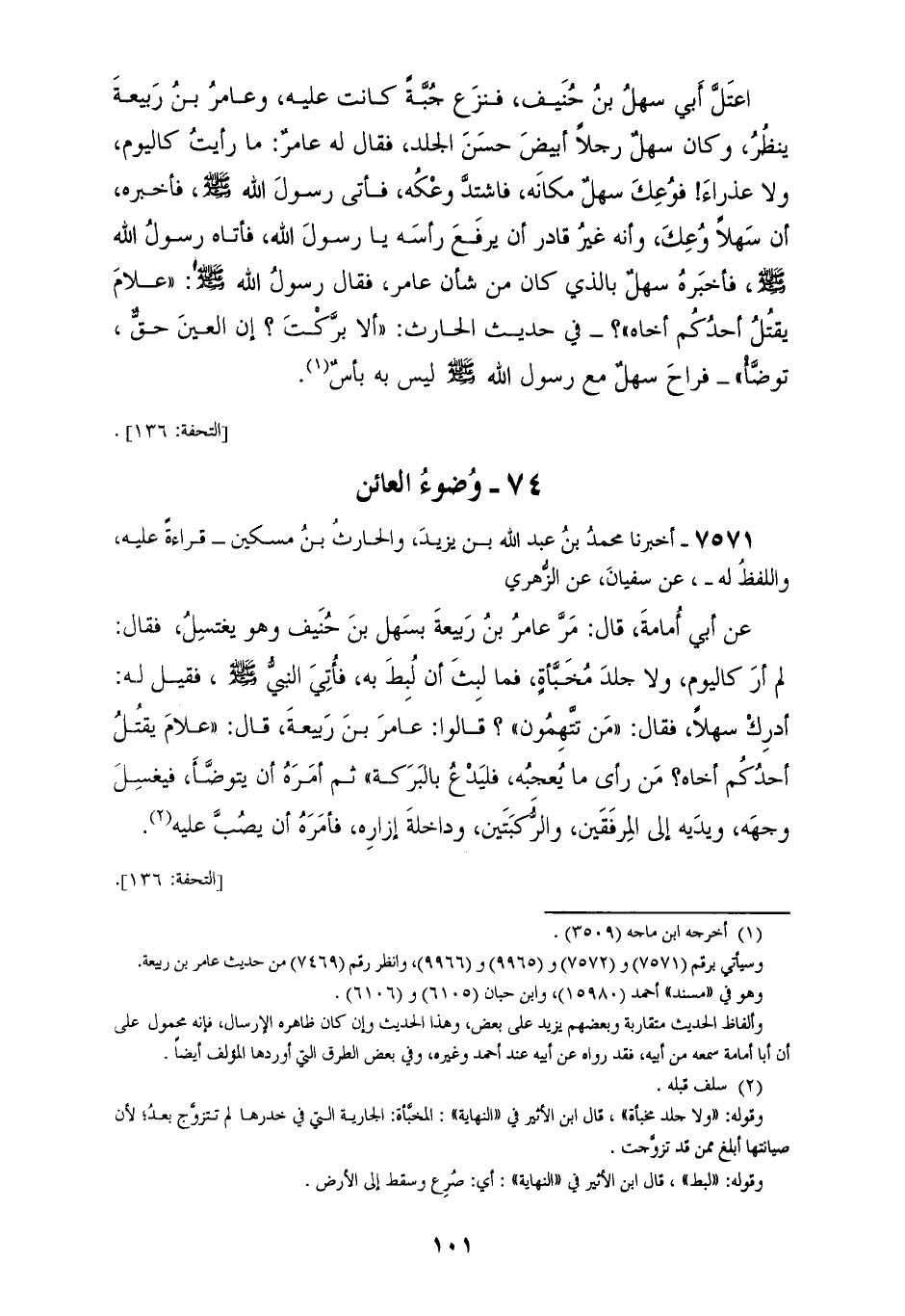 7571 - أَخْبَرَنَا مُحَمَّدُ بْنُ عَبْدِ اللهِ بْنِ يَزِيدَ، وَالْحَارِثُ بْنُ مِسْكِينٍ، قِرَاءَةً عَلَيْهِ وَاللَّفْظُ لَهُ عَنْ سُفْيَانَ، عَنِ الزُّهْرِيِّ، عَنْ أَبِي أُمَامَةَ، قَالَ: مَرَّ عَامِرُ بْنُ رَبِيعَةَ، بِسَهْلِ بْنِ حُنَيْفٍ، وَهُوَ يَغْتَسِلُ فَقَالَ: لَمْ أَرَ كَالْيَوْمِ وَلَا جِلْدَ مُخَبَّأَةٍ فَمَا لَبِثَ أَنْ لُبِطَ بِهِ، فَأُتِيَ النَّبِيُّ صَلَّى اللهُ عَلَيْهِ وَسَلَّمَ فَقِيلَ لَهُ أَدْرِكْ سَهْلًا، فَقَالَ: «مَنْ تَتَّهِمُونَ؟» قَالُوا: عَامِرَ بْنَ رَبِيعَةَ، قَالَ: «§عَلَامَ يَقْتُلُ أَحَدُكُمْ أَخَاهَ، مَنْ رَأَى مَا يُعْجِبُهُ فَلْيَدْعُ بِالْبَرَكَةِ، ثُمَّ أَمْرَهُ أَنْ يَتَوَضَّأَ فَيَغْسِلَ وَجْهَهُ وَيَدَيْهِ إِلَى الْمِرْفَقَيْنِ وَالرُّكْبَتَيْنِ وَدَاخِلَةَ إِزَارِهِ فَأَمَرَهُ أَنْ يَصُبَّ عَلَيْهِ»
