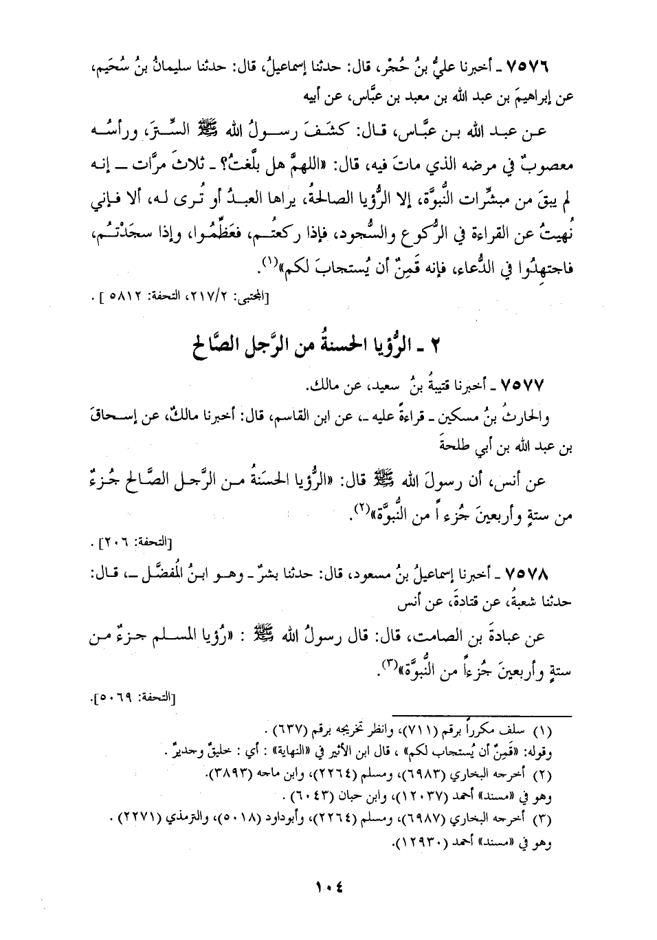 7577 - أَخْبَرَنَا قُتَيْبَةُ بْنُ سَعِيدٍ، عَنْ مَالِكٍ، وَالْحَارِثِ بْنِ مِسْكِينٍ، قِرَاءَةً عَلَيْهِ عَنِ ابْنِ الْقَاسِمِ، قَالَ: أَخْبَرَنَا مَالِكٌ، عَنْ إِسْحَاقَ بْنِ عَبْدِ اللهِ بْنِ أَبِي طَلْحَةَ، عَنْ أَنَسٍ، أَنَّ رَسُولَ اللهِ صَلَّى اللهُ عَلَيْهِ وَسَلَّمَ قَالَ: «§الرُّؤْيَا الْحَسَنَةُ مِنَ الرَّجُلِ الصَّالِحِ جُزْءٌ مِنْ سِتَّةٍ وَأَرْبَعِينَ جُزْءًا مِنَ النُّبُوَّةِ»