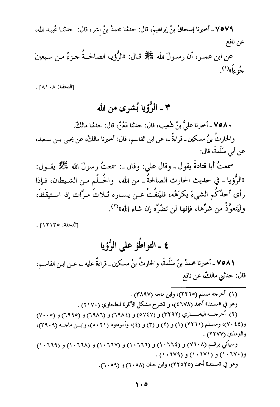 7580 - أَخْبَرَنَا عَلِيُّ بْنُ شُعَيْبٍ، قَالَ: حَدَّثَنَا مَعْنٌ، قَالَ: حَدَّثَنَا مَالِكٌ، وَالْحَارِثُ بْنُ مِسْكِينٍ، قِرَاءَةً عَنِ ابْنِ الْقَاسِمِ، قَالَ: أَخْبَرَنَا مَالِكٌ، عَنْ يَحْيَى بْنِ سَعِيدٍ، عَنْ أَبِي سَلَمَةَ، قَالَ: سَمِعْتُ أَبَا قَتَادَةَ، يَقُولُ: وَقَالَ عَلِيٌّ: وَقَالَ سَمِعْتُ رَسُولَ اللهِ صَلَّى اللهُ عَلَيْهِ وَسَلَّمَ يَقُولُ: «§الرُّؤْيَا - فِي حَدِيثِ الْحَارِثِ - الصَّالِحَةُ مِنَ اللهِ وَالْحُلُمُ مِنَ الشَّيْطَانِ، فَإِذَا رَأَى أَحَدُكُمُ الشَّيْءَ يَكْرَهُهُ فَلْيَنْفِثْ عَنْ يَسَارِهِ ثَلَاثَ مَرَّاتٍ، إِذَا اسْتَيْقَظَ وَلْيَتَعَوَّذْ مِنْ شَرَّهَا، فَإِنَّهَا لَنْ تَضُرَّهُ إِنْ شَاءَ اللهُ»