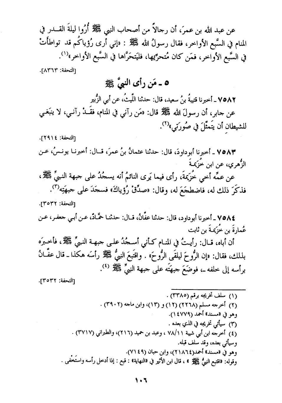 7584 - أَخْبَرَنَا أَبُو دَاوُدَ، قَالَ: حَدَّثَنَا عَفَّانُ، قَالَ: حَدَّثَنَا حَمَّادٌ، عَنْ أَبِي جَعْفَرٍ، عَنْ عُمَارَةَ بْنِ خُزَيْمَةَ بْنِ ثَابِتٍ، أَنَّ أَبَاهُ، قَالَ: رَأَيْتُ فِي الْمَنَامِ كَأَنِّي أَسْجُدُ عَلَى جَبْهَةِ النَّبِيِّ صَلَّى اللهُ عَلَيْهِ وَسَلَّمَ فَأَخْبَرَهُ بِذَلِكَ فَقَالَ: «§إِنَّ الرُّوحَ لَيَلْقَى الرُّوحَ» وَاقْتَبَعَ النَّبِيُّ صَلَّى اللهُ عَلَيْهِ وَسَلَّمَ رَأْسَهُ، هَكَذَا قَالَ عَفَّانُ: بِرَأْسِهِ إِلَى خَلْفِهِ فَوَضَعَ جَبْهَتَهُ عَلَى جَبْهَةِ النَّبِيِّ صَلَّى اللهُ عَلَيْهِ وَسَلَّمَ