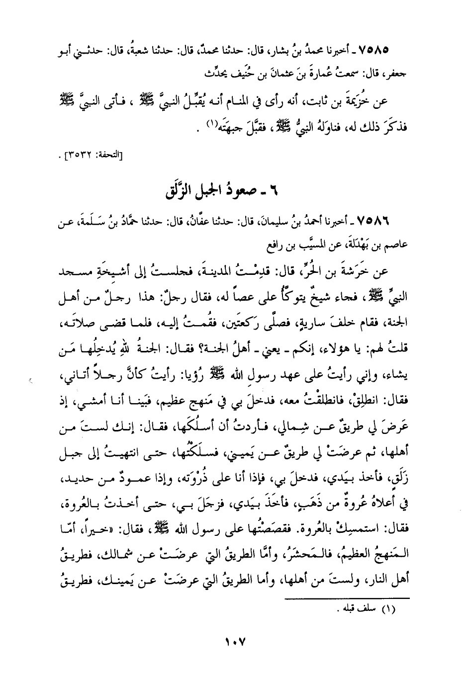 7586 - أَخْبَرَنَا أَحْمَدُ بْنُ سُلَيْمَانَ، قَالَ: حَدَّثَنَا عَفَّانُ، قَالَ: حَدَّثَنَا حَمَّادُ بْنُ سَلَمَةَ، عَنْ عَاصِمِ ابْنِ بَهْدَلَةَ، عَنِ الْمُسَيِّبِ بْنِ رَافِعٍ، عَنْ خَرَشَةَ بْنِ الْحُرِّ، قَالَ: قَدِمْتُ الْمَدِينَةَ فَجَلَسْتُ إِلَى أَشْيِخَةِ مَسْجِدِ النَّبِيِّ صَلَّى اللهُ عَلَيْهِ وَسَلَّمَ، فَجَاءَ شَيْخٌ يَتَوَكَّأُ عَلَى عَصًا لَهُ فَقَالَ رَجُلٌ: هَذَا الرَّجُلُ مِنْ أَهْلِ الْجَنَّةِ، فَقَامَ خَلْفَ سَارِيَةٍ، فَصَلَّى رَكْعَتَيْنِ فَقُمْتُ إِلَيْهِ، فَلَمَّا قَضَى صَلَاتَهُ قُلْتُ لَهُمْ: يَا هَؤُلَاءِ، إِنَّكُمْ يَعْنِي أَهْلَ الْجَنَّةِ فَقَالَ: الْجَنَّةُ لِلَّهِ يُدْخِلُهَا مَنْ يَشَاءُ، وَإِنِّي رَأَيْتُ عَلَى عَهْدِ رَسُولِ اللهِ صَلَّى اللهُ عَلَيْهِ وَسَلَّمَ رُؤْيَا، رَأَيْتُ كَأَنَّ رَجُلًا أَتَانِي فَقَالَ: انْطَلِقْ فَانْطَلَقْتُ مَعَهُ فَدَخَلَ بِي فِي مَنْهَجٍ عَظِيمٍ، فَبَيْنَا أَنَا أَمْشِي إِذْ عَرَضَ لِي طَرِيقٌ عَنْ شِمَالِي، فَأَرَدْتُ أَنْ أَسْلُكَهَا فَقَالَ: إِنَّكَ لَسْتَ مِنْ أَهْلِهَا، ثُمَّ عَرَضَتْ لِي طَرِيقٌ عَنْ يَمِينِي فَسَلَكْتُهَا حَتَّى انْتَهَيْتُ إِلَى جَبَلٍ زَلِقٍ فَأَخَذَ بِيَدِي، فَدَخَلَ بِي، فَإِذَا أَنَا عَلَى ذُرْوَتِهِ، وَإِذَا عَمُودٌ مِنْ حَدِيدٍ فِي أَعْلَاهُ عُرْوَةٌ مِنْ ذَهَبٍ، فَأَخَذَ بِيَدِي فَزَجَلَ بِي حَتَّى أَخَذْتُ بِالْعُرْوَةِ فَقَالَ: اسْتَمْسِكْ بِالْعُرْوَةِ فَقَصَصْتُهَا عَلَى رَسُولِ اللهِ صَلَّى اللهُ عَلَيْهِ وَسَلَّمَ فَقَالَ: «§خَيْرًا، أَمَّا الْمَنْهَجُ الْعَظِيمُ فَالْمَحْشَرُ، وَأَمَّا الطَّرِيقُ الَّتِي عَرَضَتْ عَنْ شِمَالِكَ فَطَرِيقُ أَهْلِ النَّارِ وَلَسْتَ مِنْ أَهْلِهَا، وَأَمَّا الطَّرِيقُ الَّتِي عَرَضَتْ عَنْ يَمِينِكَ فَطَرِيقُ أَهْلِ الْجَنَّةِ، وَأَمَّا الْجَبَلُ الزَّلِقُ فَمَنْزِلَةُ الشُّهَدَاءِ، وَأَمَّا الْعُرْوَةُ الَّتِي اسْتَمْسَكْتَ بِهَا فَعُرْوَةُ الْإِسْلَامِ فَاسْتَمْسِكْ بِهَا حَتَّى تَمُوتَ» فَأَنَا أَرْجُو أَنْ أَكُونَ مِنْ أَهْلِهَا