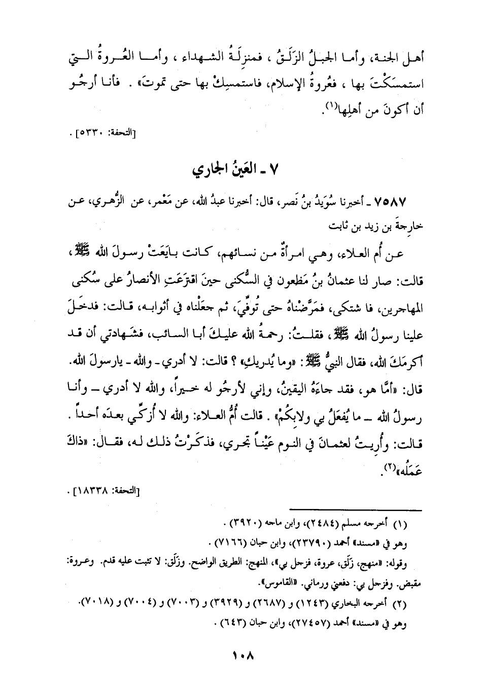 7587 - أَخْبَرَنَا سُوَيْدُ بْنُ نَصْرٍ، قَالَ: أَخْبَرَنَا عَبْدُ اللهِ عَنْ مَعْمَرٍ، عَنِ الزُّهْرِيِّ، عَنْ خَارِجَةَ بْنِ زَيْدِ بْنِ ثَابِتٍ، عَنْ أُمِّ الْعَلَاءِ، وَهِيَ امْرَأَةٌ مِنْ نِسَائِهِمْ كَانَتْ بَايَعَتْ رَسُولَ اللهِ صَلَّى اللهُ عَلَيْهِ وَسَلَّمَ قَالَتْ: صَارَ لَنَا عُثْمَانُ بْنُ مَظْعُونٍ فِي السُّكْنَى حِينَ اقْتَرَعَتِ الْأَنْصَارُ عَلَى سُكْنَى الْمُهَاجِرِينَ فَاشْتَكَى فَمَرَّضْنَاهُ حَتَّى تُوُفِّيَ، ثُمَّ جَعَلْنَاهُ فِي أَثْوَابِهِ قَالَتْ: فَدَخَلَ عَلَيْنَا رَسُولُ اللهِ صَلَّى اللهُ عَلَيْهِ وَسَلَّمَ، فَقُلْتُ: رَحْمَةُ اللهِ عَلَيْكَ أَبَا السَّائِبِ فَشَهَادَتِي: أَنْ قَدْ أَكْرَمَكَ اللهُ فَقَالَ النَّبِيُّ صَلَّى اللهُ عَلَيْهِ وَسَلَّمَ: «§وَمَا يُدْرِيكِ؟» قَالَتْ: لَا أَدْرِي وَاللهِ يَا رَسُولَ اللهِ، قَالَ: «أَمَّا هُوَ فَقَدْ جَاءَهُ الْيَقِينُ وَإِنِّي لَأَرْجُو لَهُ خَيْرًا وَاللهِ لَا أَدْرِي وَأَنَا رَسُولُ اللهِ مَا يُفْعَلُ بِي وَلَا بِكُمْ» قَالَتْ أُمُّ الْعَلَاءِ: وَاللهِ لَا أُزَكِّي بَعْدَهُ أَحَدًا قَالَتْ: وَأُرِيتُ لِعُثْمَانَ فِي النَّوْمِ عَيْنًا تَجْرِي فَذَكَرْتُ ذَلِكَ لَهُ فَقَالُ: «ذَاكَ عَمَلُهُ»
