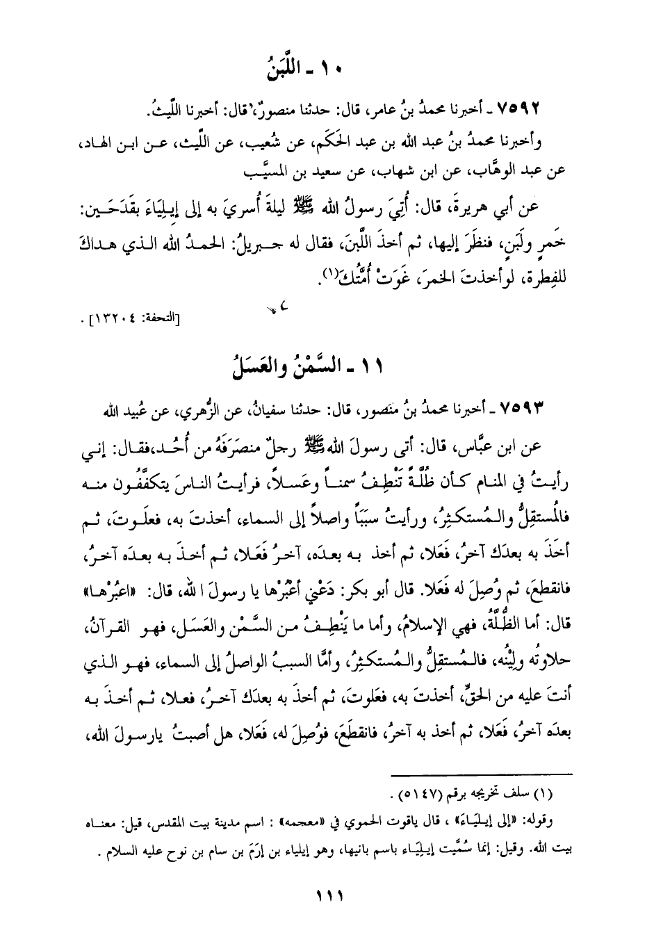 7593 - أَخْبَرَنَا مُحَمَّدُ بْنُ مَنْصُورٍ، قَالَ: حَدَّثَنَا سُفْيَانُ، عَنِ الزُّهْرِيِّ، عَنْ عُبَيْدِ اللهِ، عَنِ ابْنِ عَبَّاسٍ، قَالَ: أَتَى رَسُولَ اللهِ صَلَّى اللهُ عَلَيْهِ وَسَلَّمَ رَجُلٌ مُنْصَرَفَهُ مِنْ أَحِدٍ فَقَالَ: إِنِّي رَأَيْتُ فِي الْمَنَامِ كَأَنَّ ظُلَّةً تَنْطُفُ سَمْنًا وَعَسَلًا، فَرَأَيْتُ النَّاسَ يَتَكَفَّفُونَ مِنْهُ فَالْمُسْتَقِلُّ وَالْمُسْتَكْثِرُ، وَرَأَيْتُ سَبَبًا وَاصِلًا إِلَى السَّمَاءِ أَخَذْتَ بِهِ فَعَلَوْتَ، ثُمَّ أَخَذَ بِهِ بَعْدَكَ آخَرُ فَعَلَا، ثُمَّ أَخَذَ بِهِ بَعْدَهُ آخَرُ فَعَلَا، ثُمَّ أَخَذَ بِهِ بَعْدَهُ آخَرُ فَانْقَطَعَ، ثُمَّ وُصِلَ لَهُ فَعَلَا، قَالَ أَبُو بَكْرٍ: دَعْنِي أَعْبُرْهَا يَا رَسُولَ اللهِ، قَالَ: «§أَعْبُرْهَا» قَالَ: أَمَّا الظُّلَّةُ فَهِيَ الْإِسْلَامُ، وَأَمَّا مَا يَنْطُفُ مِنَ السَّمْنِ وَالْعَسَلِ فَهُوَ الْقُرْآنُ حَلَاوَتُهُ وَلِينُهُ فَالْمُسْتَقِلُّ وَالْمُسْتَكْثِرُ، وَأَمَّا السَّبَبُ الْوَاصِلُ إِلَى السَّمَاءِ فَهُوَ الَّذِي أَنْتَ عَلَيْهِ مِنَ الْحَقُّ أَخَذْتَ بِهِ فَعَلَوْتَ، ثُمَّ أَخَذَ بِهِ بَعْدَكَ آخَرُ فَعَلَا، ثُمَّ أَخَذَ بِهِ بَعْدَهُ آخَرُ فَعَلَا، ثُمَّ أَخَذَ بِهِ آخَرُ فَانْقَطَعَ، فَوُصِلَ لَهُ فَعَلَا، هَلْ أَصَبْتُ يَا رَسُولَ اللهِ، أَمْ أَخْطَأْتُ؟ فَقَالَ: «أَصَبْتَ بَعْضًا وَأَخْطَأْتَ بَعْضًا» قَالَ: أَقْسَمْتُ؟ قَالَ: «لَا تُقْسِمْ»