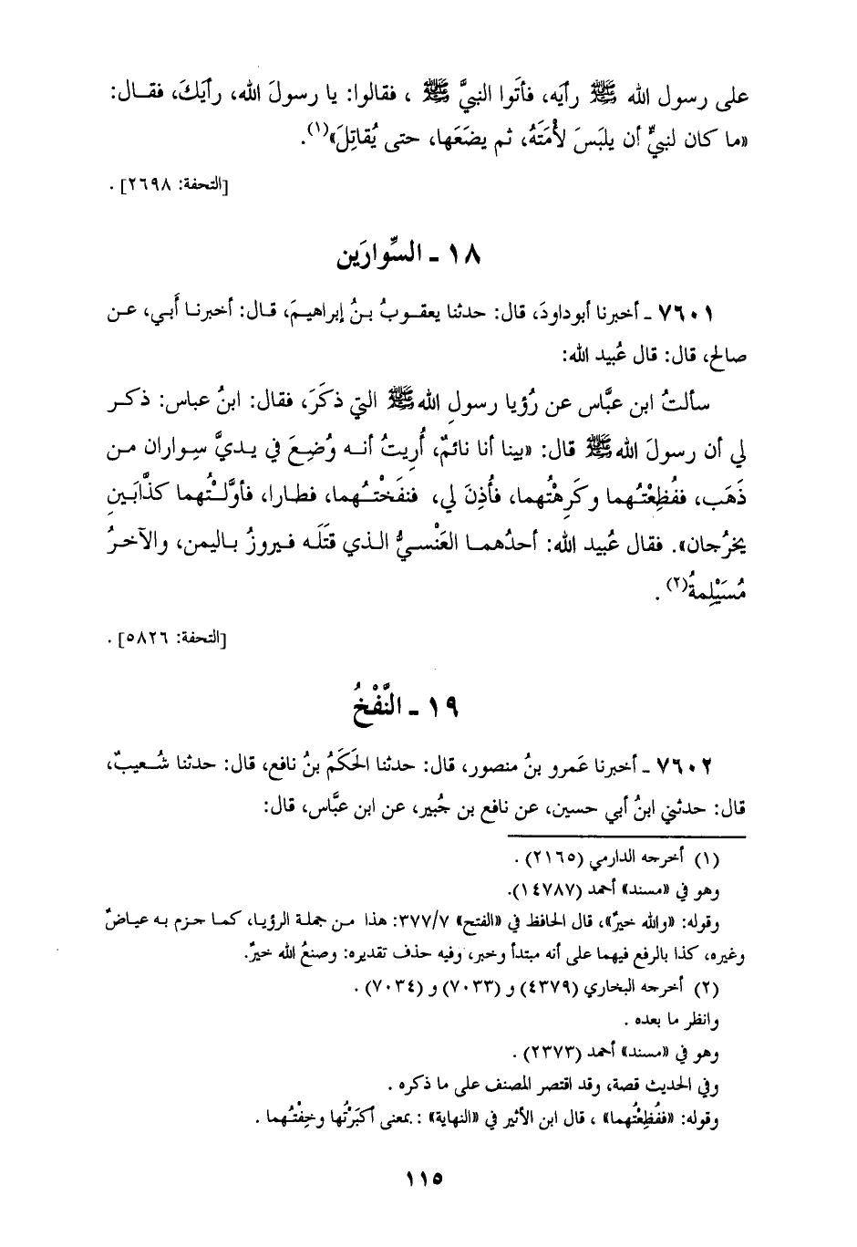 7601 - أَخْبَرَنَا أَبُو دَاوُدَ، قَالَ: حَدَّثَنَا يَعْقُوبُ بْنُ إِبْرَاهِيمَ، قَالَ: أَخْبَرَنَا أَبِي، عَنْ صَالِحٍ، قَالَ: قَالَ عُبَيْدُ اللهِ: سَأَلْتُ ابْنَ عَبَّاسٍ، عَنْ رُؤْيَا رَسُولِ اللهِ صَلَّى اللهُ عَلَيْهِ وَسَلَّمَ الَّتِي ذَكَرَ فَقَالَ ابْنُ عَبَّاسٍ: ذُكِرَ لِي أَنَّ رَسُولَ اللهِ صَلَّى اللهُ عَلَيْهِ وَسَلَّمَ قَالَ: " §بَيْنَا أَنَا نَائِمٌ أُرِيتُ أَنَّهُ وُضِعَ فِي يَدَيَّ سِوَارَانِ مِنْ ذَهَبٍ فَفَظَعْتُهُمَا وَكَرِهْتُهُمَا، فَأُذِنَ لِي فَنَفَخْتُهُمَا فَطَارَا فَأَوَّلْتُهُمَا كَذَّابَيْنِ: يَخْرُجَانِ " فَقَالَ عُبَيْدُ اللهِ: أَحَدُهُمَا الْعَنْسِيُّ الَّذِي قَتَلَهُ فَيْرُوزُ بِالْيَمَنِ، وَالْآخَرُ مُسَيْلِمَةُ