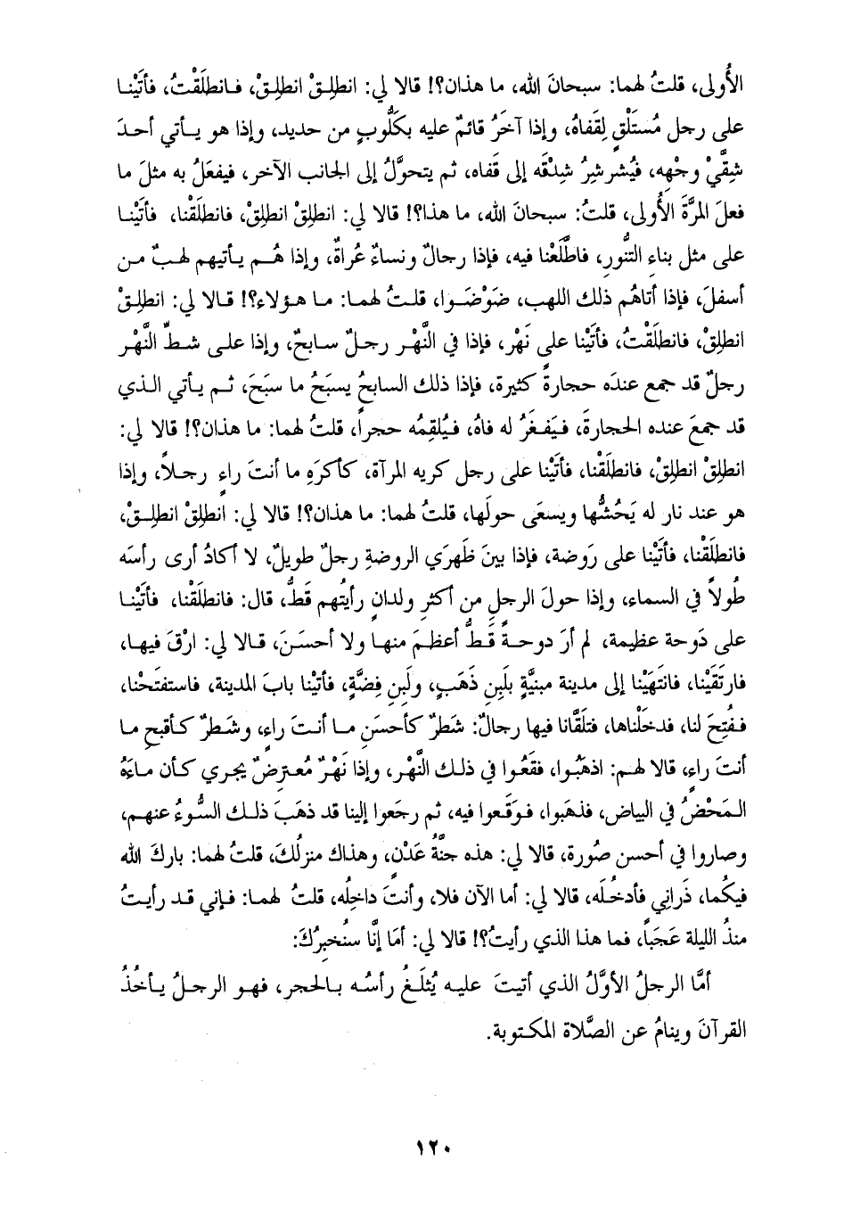 7611 - أَخْبَرَنَا مُحَمَّدُ بْنُ عَبْدِ الْأَعْلَى، قَالَ: حَدَّثَنَا الْمُعْتَمِرُ، قَالَ: سَمِعْتُ عَوْفًا، قَالَ: حَدَّثَنَا أَبُو رَجَاءٍ، أَنَّهُ حَدَّثَهُمْ سَمُرَةُ، قَالَ: كَانَ رَسُولُ اللهِ صَلَّى اللهُ عَلَيْهِ وَسَلَّمَ مِمَّا يُكْثِرُ أَنْ يَقُولَ لِأَصْحَابِهِ: «§هَلْ رَأَى أَحَدٌ مِنْكُمْ رُؤْيَا؟» قَالَ فَيُقَصُّ عَلَيْهِ مَا شَاءَ اللهُ أَنْ يُقَصَّ قَالَ، وَإِنَّهُ قَالَ لَنَا ذَاتَ غَدَاةٍ: " أَتَانِي اللَّيْلَةَ آتِيَانِ، وَإِنَّهُمَا ابْتَعَثَانِي وَإِنَّهُمَا قَالَا لِي: انْطَلِقْ وَإِنِّي انْطَلَقْتُ مَعَهُمَا وَإِنَّا أَتَيْنَا عَلَى رَجُلٍ مُضْطَجِعٍ، وَإِذَا آخَرُ قَائِمٌ عَلَيْهِ بِصَخْرَةٍ، وَإِذَا هُوَ يَهْوِي بِالصَّخْرَةِ لِرَأْسِهِ فَيَثْلُغَ رَأْسَهُ فَيَتَدَهْدُهُ الْحَجَرُ هَاهُنَا فَيَتْبَعُ الْحَجَرَ فَيَأْخُذُهُ، فَمَا يَرْجِعُ إِلَيْهِ حَتَّى يَصِحَّ رَأْسُهُ كَمَا كَانَ، ثُمَّ يَعُودُ إِلَيْهِ فَيَفْعَلُ بِهِ مِثْلَ مَا فَعَلَ بِالْمَرَّةِ الْأُولَى قُلْتُ لَهُمَا: سُبْحَانَ اللهِ مَا هَذَانِ؟ قَالَا لِي: انْطَلِقِ انْطَلِقْ فَانْطَلَقْتُ فَأَتَيْنَا عَلَى رَجُلٍ مُسْتَلْقٍ لِقَفَاهُ، وَإِذَا آخَرُ قَائِمٌ عَلَيْهِ بِكَلُّوبٍ مِنْ حَدِيدٍ، وَإِذَا هُوَ يَأْتِي أَحَدَ شِقَّيْ وَجْهِهِ فَيُشَرْشِرُ شِدْقَهُ إِلَى قَفَاهُ، ثُمَّ يَتَحَوَّلُ إِلَى الْجَانِبِ الْآخَرِ فَيَفْعَلُ بِهِ مِثْلَ مَا فَعَلَ الْمَرَّةَ الْأُولَى قُلْتُ: سُبْحَانَ اللهِ مَا هَذَا؟ قَالَا لِي: انْطَلِقِ انْطَلِقْ فَانْطَلَقْنَا فَأَتَيْنَا عَلَى مِثْلِ بِنَاءِ التَّنُّورِ فَاطَّلَعْنَا فِيهِ فَإِذَا رِجَالٌ وَنِسَاءٌ عُرَاةٌ، وَإِذَا هُمْ يَأْتِيهِمْ لَهَبٌ مِنْ أَسْفَلَ، فَإِذَا أَتَاهُمْ ذَلِكَ اللهَبُ ضَوْضَوْا قُلْتُ لَهُمَا: مَا هَؤُلَاءِ؟ قَالَا لِي: انْطَلِقِ انْطَلِقْ فَانْطَلَقْتُ فَأَتَيْنَا عَلَى نَهْرٍ، فَإِذَا فِي النَّهْرِ رَجُلٌ سَابِحٌ، وَإِذَا عَلَى شَطِّ النَّهَرِ رَجُلٌ قَدْ جَمَعَ عِنْدَهُ حِجَارَةً كَثِيرَةً، فإذا ذَلِكَ السَّابِحُ يَسْبَحُ مَا سَبَحَ، ثُمَّ يَأْتِي الَّذِي قَدْ جَمَعَ عِنْدَهُ الْحِجَارَةَ فَيَفْغَرُ لَهُ فَاهُ فَيُلْقِمَهُ حَجَرًا قُلْتُ لَهُمَا: مَا هَذَانِ؟ قَالَا لِي: انْطَلِقِ انْطَلِقْ فَانْطَلَقْنَا فَأَتَيْنَا عَلَى رَجُلٍ كَرِيهِ الْمَرْآةِ كَأَكْرَهِ مَا أَنْتَ رَاءٍ رَجُلًا وَإِذَا هُوَ عِنْدَ نَارٍ لَهُ يَحُشُّهَا وَيَسْعَى حَوْلَهَا قُلْتُ لَهُمَا: مَا هَذَانِ؟ قَالَا لِي: انْطَلِقِ انْطَلِقْ فَانْطَلَقْنَا فَأَتَيْنَا عَلَى رَوْضَةٍ، فَإِذَا بَيْنَ ظَهْرَيِ الرَّوْضَةِ رَجُلٌ طَوِيلٌ لَا أَكَادُ أَرَى رَأْسَهُ طُولًا فِي السَّمَاءِ -[121]-، وَإِذَا حَوْلَ الرَّجُلِ مِنْ أَكْثَرِ وِلْدَانٍ رَأَيْتُهُمْ قَطُّ قَالَ: فَانْطَلَقْنَا فَأَتَيْنَا عَلَى دَوْحَةٍ عَظِيمَةٍ لَمْ أَرَ دَوْحَةً قَطُّ أَعْظَمَ مِنْهَا وَلَا أَحْسَنَ قَالَا لِي: ارْقَ فِيهَا فَارْتَقَيْنَا فَانْتَهَيْنَا إِلَى مَدِينَةٍ مَبْنِيَّةٍ بِلَبِنٍ ذَهَبٍ وَلَبِنٍ فِضَّةٍ فَأَتَيْنَا بَابَ الْمَدِينَةِ فاستفتحنا فَفُتِحَ لَنَا فَدَخَلْنَاهَا فَتَلَقَّانَا فِيهَا رِجَالٌ شَطْرٌ كَأَحْسَنِ مَا أَنْتَ رَاءٍ وَشَطْرٌ كَأَقْبَحِ مَا أَنْتَ رَاءٍ قَالَا لَهُمْ: اذْهَبُوا فَقَعُوا فِي ذَلِكَ النَّهْرِ وَإِذَا نَهْرٌ مُعْتَرِضٌ يَجْرِي كَأَنَّ مَاءَهُ الْمَحْضُ فِي الْبَيَاضِ فَذَهَبُوا فَوَقَعُوا فِيهِ، ثُمَّ رَجَعُوا إِلَيْنَا قَدْ ذَهَبَ ذَلِكَ السَّوْءُ عَنْهُمْ وَصَارُوا فِي أَحْسَنِ صُورَةٍ قَالَا لِي: هَذِهِ جَنَّةُ عَدْنٍ وَهَذَاكَ مَنْزِلُكَ قُلْتُ لَهُمَا: بَارَكَ اللهُ فِيكُمَا ذَرَانِي فَأَدْخُلُهُ قَالَا لِي: أَمَّا الْآنَ