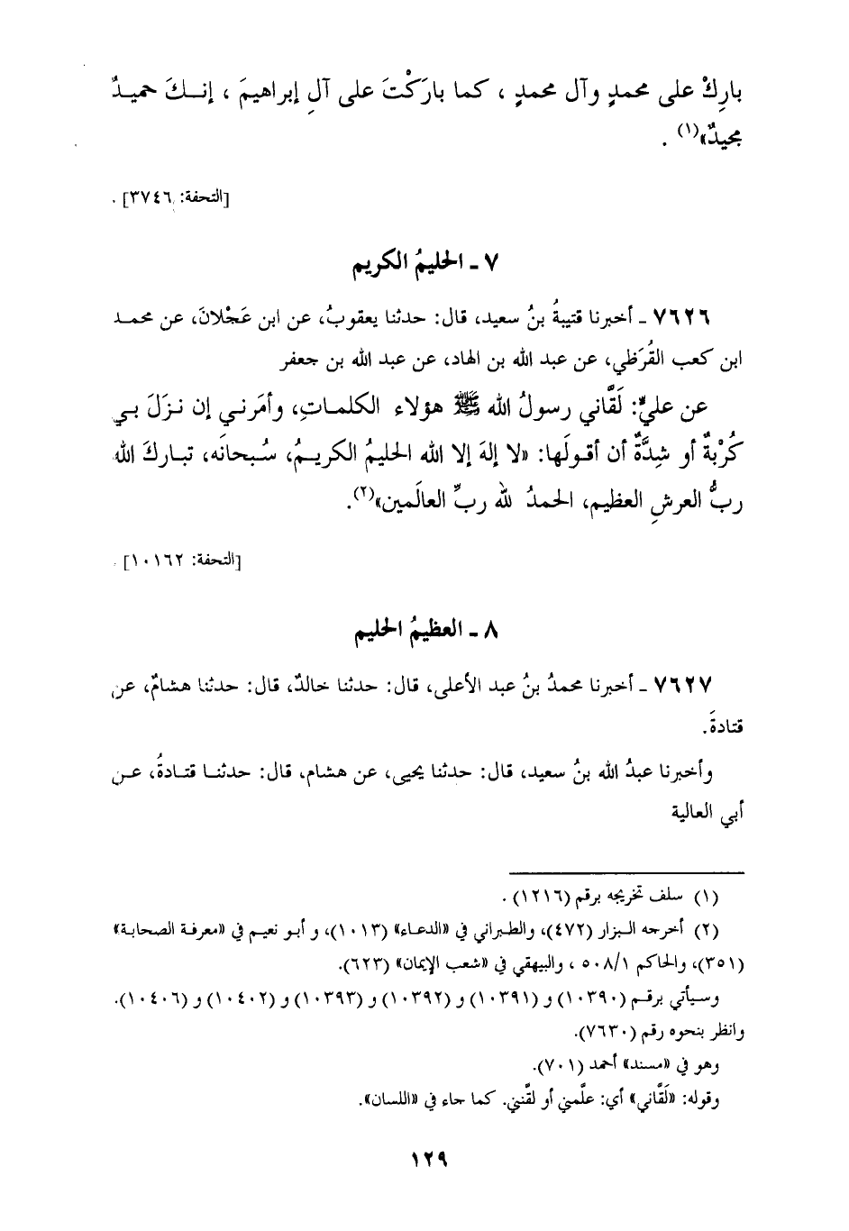 7626 - أَخْبَرَنَا قُتَيْبَةُ بْنُ سَعِيدٍ، قَالَ: حَدَّثَنَا يَعْقُوبُ، عَنِ ابْنِ عَجْلَانَ، عَنْ مُحَمَّدِ بْنِ كَعْبٍ الْقُرَظِيِّ، عَنْ عَبْدِ اللهِ بْنِ الْهَادِ، عَنْ عَبْدِ اللهِ بْنِ جَعْفَرٍ، عَنْ عَلِيٍّ، لَقَّانِي رَسُولُ اللهِ صَلَّى اللهُ عَلَيْهِ وَسَلَّمَ هَؤُلَاءِ الْكَلِمَاتِ، وَأَمَرَنِي §إِنْ نَزَلَ بِي كُرْبَةٌ أَوْ شِدَّةٌ أَنْ أَقُولَهَا «لَا إِلَهَ إِلَّا اللهُ الْحَلِيمُ الْكَرِيمُ، سُبْحَانَهُ تَبَارَكَ اللهُ رَبُّ الْعَرْشِ الْعَظِيمِ، الْحَمْدُ لِلَّهِ رَبِّ الْعَالَمِينَ»