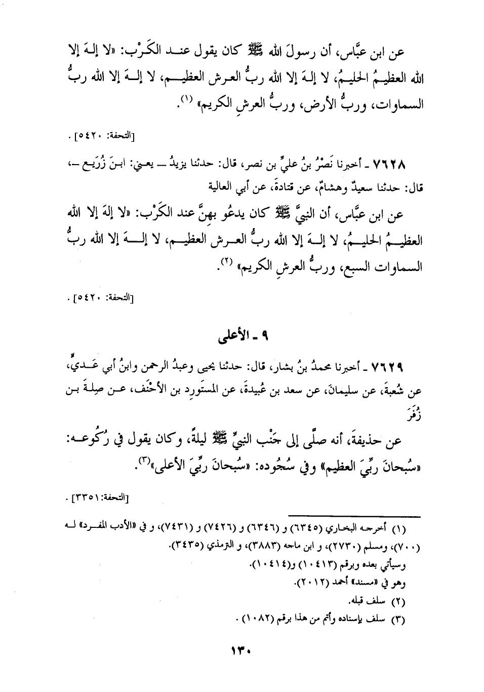 7628 - أَخْبَرَنَا نَصْرُ بْنُ عَلِيِّ بْنِ نَصْرٍ، قَالَ: حَدَّثَنَا يَزِيدُ يَعْنِي ابْنَ زُرَيْعٍ، قَالَ: حَدَّثَنَا سَعِيدٌ، وَهِشَامٌ، عَنْ قَتَادَةَ، عَنْ أَبِي الْعَالِيَةِ، عَنِ ابْنِ عَبَّاسٍ، أَنَّ النَّبِيَّ صَلَّى اللهُ عَلَيْهِ وَسَلَّمَ كَانَ يَدْعُو بِهِنَّ §عِنْدَ الْكَرْبُ «لَا إِلَهَ إِلَّا اللهُ الْعَظِيمُ الْحَلِيمُ، لَا إِلَهَ إِلَّا اللهُ رَبُّ الْعَرْشِ الْعَظِيمِ، لَا إِلَهَ إِلَّا اللهُ رَبُّ السَّمَوَاتِ السَّبْعِ وَرَبُّ الْعَرْشِ الْكَرِيمِ»