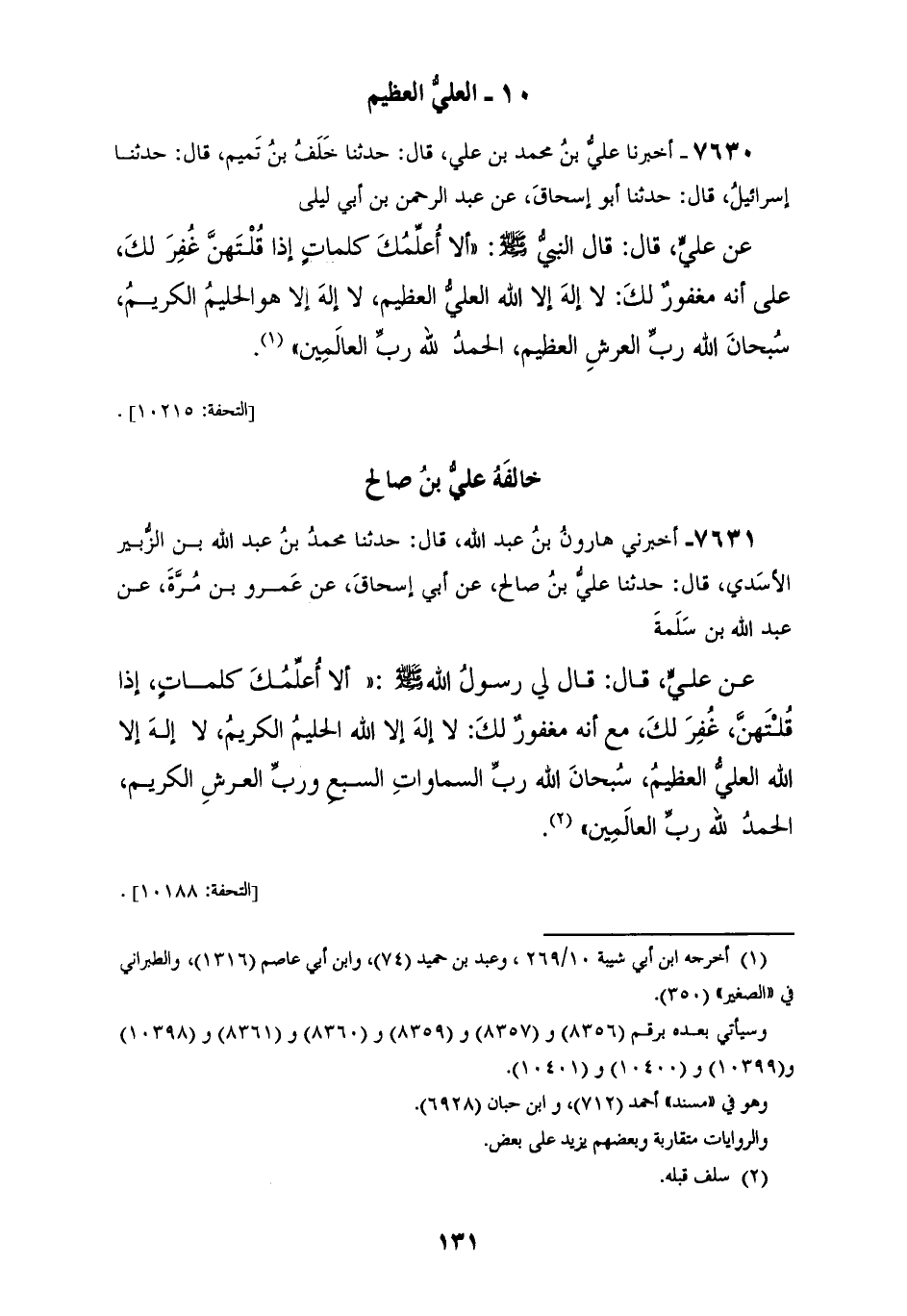 7630 - أَخْبَرَنَا عَلِيُّ بْنُ مُحَمَّدِ بْنِ عَلِيٍّ، قَالَ: حَدَّثَنَا خَلَفُ بْنُ تَمِيمٍ، قَالَ: حَدَّثَنَا إِسْرَائِيلُ، قَالَ: حَدَّثَنَا أَبُو إِسْحَاقَ، عَنْ عَبْدِ الرَّحْمَنِ بْنِ أَبِي لَيْلَى، عَنْ عَلِيٍّ، قَالَ: قَالَ النَّبِيُّ صَلَّى اللهُ عَلَيْهِ وَسَلَّمَ: «§أَلَا أُعَلِّمُكَ كَلِمَاتٍ إِذَا قُلْتَهُنَّ غُفِرَ لَكَ عَلَى أَنَّهُ مَغْفُورٌ لَكَ؟ لَا إِلَهَ إِلَّا اللهُ الْعَلِيُّ الْعَظِيمُ، لَا إِلَهَ إِلَّا هُوَ الْحَلِيمُ الْكَرِيمُ، سُبْحَانَ اللهِ رَبِّ الْعَرْشِ الْعَظِيمِ، الْحَمْدُ لِلَّهِ رَبِّ الْعَالَمِينَ» خَالَفَهُ عَلِيُّ بْنُ صَالِحٍ