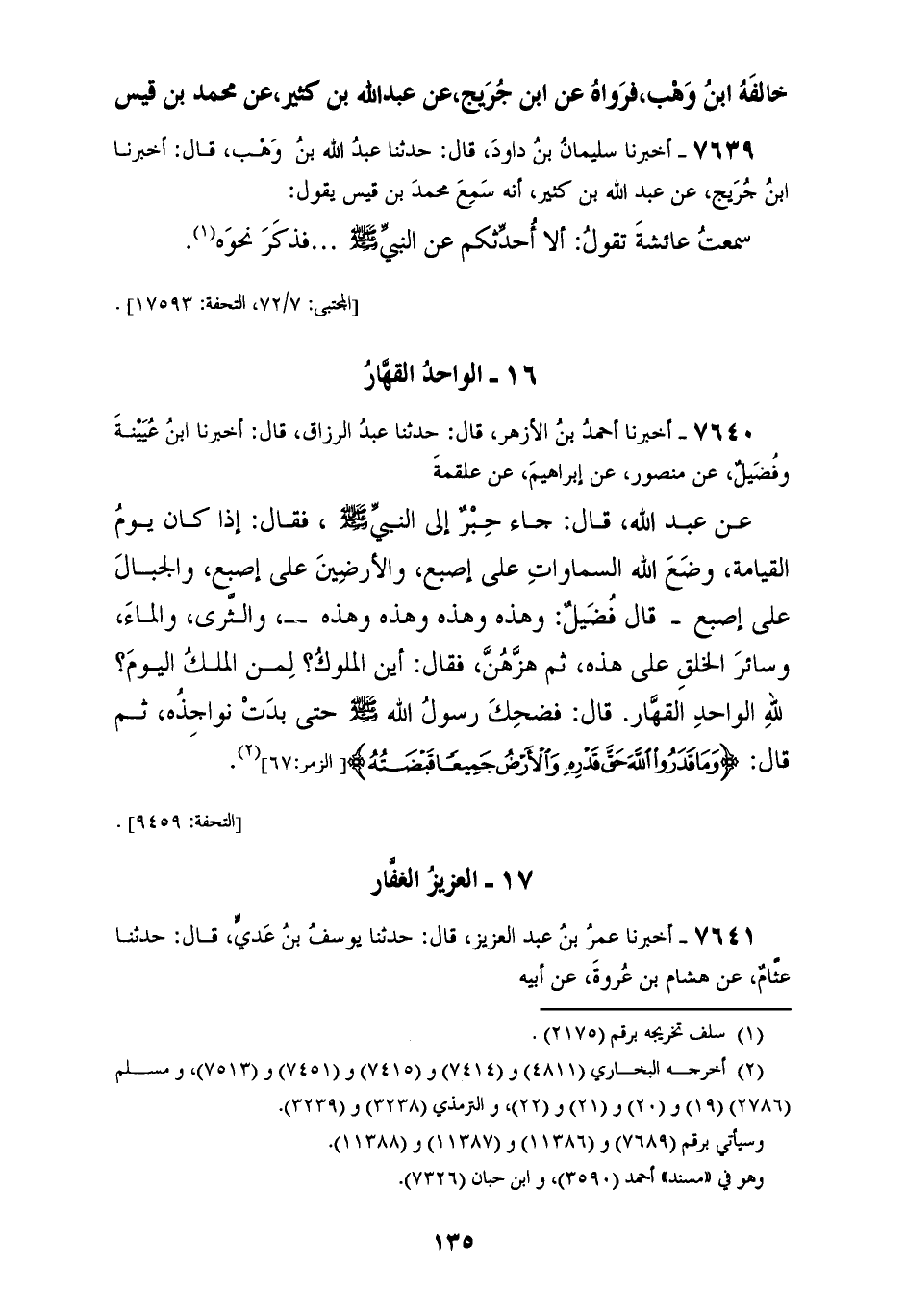 7640 - أَخْبَرَنَا أَحْمَدُ بْنُ الْأَزْهَرِ، قَالَ: حَدَّثَنَا عَبْدُ الرَّزَّاقِ، قَالَ: أَخْبَرَنَا ابْنُ عُيَيْنَةَ، وَفُضَيْلٌ، عَنْ مَنْصُورٍ، عَنْ إِبْرَاهِيمَ، عَنْ عَلْقَمَةَ، عَنْ عَبْدِ اللهِ، قَالَ: جَاءَ حَبْرٌ إِلَى النَّبِيِّ صَلَّى اللهُ عَلَيْهِ وَسَلَّمَ فَقَالَ: إِذَا كَانَ يَوْمُ الْقِيَامَةِ وَضَعَ اللهُ السَّمَوَاتِ عَلَى إِصْبَعٍ، وَالْأَرَضِينَ عَلَى إِصْبَعٍ، وَالْجِبَالَ عَلَى إِصْبَعٍ، قَالَ فُضَيْلٌ: وَهَذِهِ وَهَذِهِ وَهَذِهِ وَهَذِهِ وَالثَّرَى وَالْمَاءُ وَسَائِرُ الْخَلْقِ عَلَى هَذِهِ، ثُمَّ هَزَّهُنَّ فَقَالَ: أَيْنَ الْمُلُوكُ لِمَنِ الْمُلْكَ الْيَوْمَ لِلَّهِ الْوَاحِدِ الْقَهَّارِ، قَالَ: فَضَحِكَ رَسُولُ اللهِ صَلَّى اللهُ عَلَيْهِ وَسَلَّمَ حَتَّى بَدَتْ نَوَاجِذُهُ ثُمَّ قَالَ: {§وَمَا قَدَرُوا اللهِ حَقَّ قَدْرِهِ وَالْأَرْضُ جَمِيعًا قَبْضَتُهُ} [الزمر: 67]
