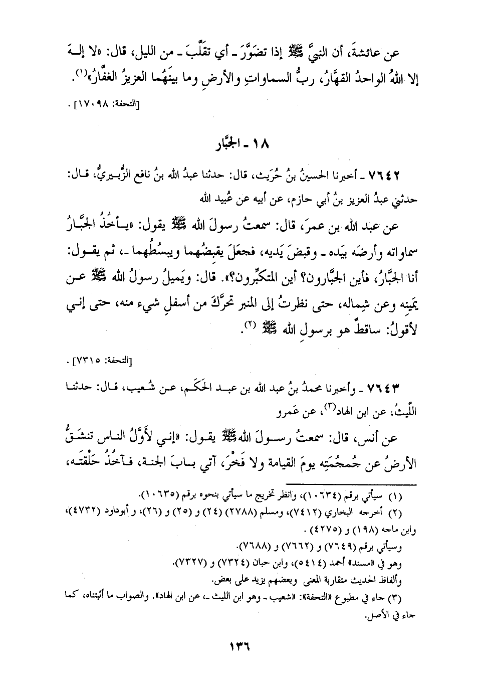 7642 - أَخْبَرَنَا الْحُسَيْنُ بْنُ حُرَيْثٍ، قَالَ: حَدَّثَنَا عَبْدُ اللهِ بْنُ نَافِعٍ الزُّبَيْرِيُّ، قَالَ: حَدَّثَنِي عَبْدُ الْعَزِيزِ بْنُ أَبِي حَازِمٍ، عَنْ أَبِيهِ، عَنْ عُبَيْدِ اللهِ، عَنْ عَبْدِ اللهِ بْنِ عُمَرَ، قَالَ: سَمِعْتُ رَسُولَ اللهِ صَلَّى اللهُ عَلَيْهِ وَسَلَّمَ يَقُولُ: " §يَأْخُذُ الْجَبَّارُ سَمَوَاتِهِ وَأَرَضَهُ بِيَدِهِ وَقَبَضَ يَدَيْهِ فَجَعَلَ يَقْبِضُهُمَا وَيَبْسُطُهُمَا ثُمَّ يَقُولُ: أَنَا الْجَبَّارُ فَأَيْنَ الْجَبَّارُونَ؟ أَيْنَ الْمُتَكَبِّرُونَ؟ " قَالَ: وَيَمِيلُ رَسُولُ اللهِ صَلَّى اللهُ عَلَيْهِ وَسَلَّمَ عَنْ يَمِينِهِ وَعَنْ شِمَالِهِ، حَتَّى نَظَرْتُ إِلَى الْمِنْبَرِ تَحَرَّكَ مِنْ أَسْفَلِ شَيْءٍ مِنْهُ، حَتَّى إِنِّي لَأَقُولُ سَاقِطٌ هُوَ بِرَسُولِ اللهِ صَلَّى اللهُ عَلَيْهِ وَسَلَّمَ