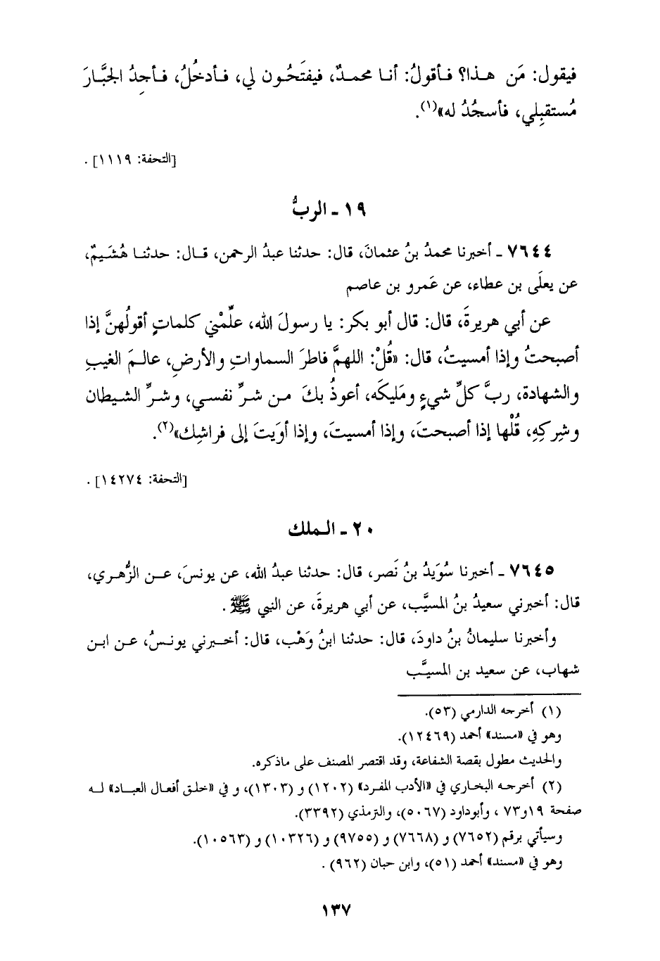 7644 - أَخْبَرَنَا مُحَمَّدُ بْنُ عُثْمَانَ، قَالَ: حَدَّثَنَا عَبْدُ الرَّحْمَنِ، قَالَ: حَدَّثَنَا هُشَيْمٌ، عَنْ يَعْلَى بْنِ عَطَاءٍ، عَنْ عَمْرِو بْنِ عَاصِمٍ، عَنْ أَبِي هُرَيْرَةَ، قَالَ: قَالَ أَبُو بَكْرٍ: يَا رَسُولَ اللهِ، عَلِّمْنِي §كَلِمَاتٍ أَقُولُهُنَّ إِذَا أَصْبَحْتُ وَإِذَا أَمْسَيْتُ قَالَ: " قُلِ: اللهُمَّ فَاطِرَ السَّمَوَاتِ وَالْأَرْضِ، عَالِمَ الْغَيْبِ وَالشَّهَادَةِ رَبَّ كُلِّ شَيْءٍ وَمَلِيكَهُ، أَعُوذُ بِكَ مِنْ شَرِّ نَفْسِي وَشَرِّ الشَّيْطَانِ وَشِرْكِهِ «قُلْهَا إِذَا أَصْبَحْتَ وَإِذَا أَمْسَيْتَ، وَإِذَا أَوَيْتَ إِلَى فِرَاشِكَ»
