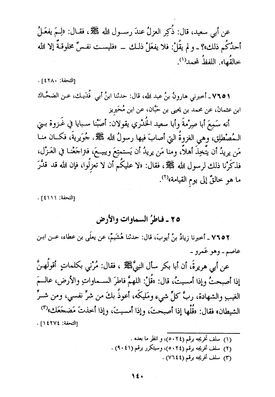 7650 - أَخْبَرَنَا قُتَيْبَةُ بْنُ سَعِيدٍ، فِي حَدِيثِهِ عَنْ سُفْيَانَ، وَأَخْبَرَنَا مُحَمَّدُ بْنُ عَبْدِ اللهِ بْنِ يَزِيدَ، قَالَ: حَدَّثَنَا سُفْيَانُ، عَنِ ابْنِ أَبِي نَجِيحٍ، عَنْ مُجَاهِدٍ، عَنْ قَزَعَةَ، عَنْ أَبِي سَعِيدٍ، قَالَ: ذُكِرَ الْعَزْلُ عِنْدَ رَسُولِ اللهِ صَلَّى اللهُ عَلَيْهِ وَسَلَّمَ فَقَالَ: «§لِمَ يَفْعَلُ أَحَدُكُمْ ذَلِكَ» وَلَمْ يَقُلْ: «فَلَا يَفْعَلْ ذَلِكَ فَلَيْسَتْ نَفْسٌ مَخْلُوقَةٌ إِلَّا اللهُ خَالِقُهَا» اللَّفْظُ لِمُحَمَّدٍ
