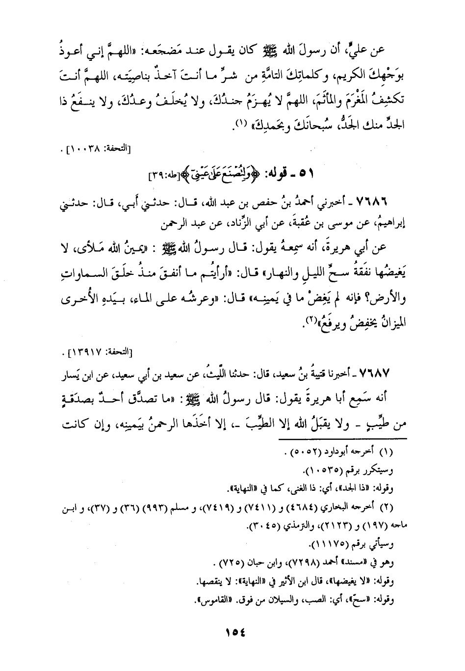 7686 - أَخْبَرَنِي أَحْمَدُ بْنُ حَفْصِ بْنِ عَبْدِ اللهِ، قَالَ: حَدَّثَنِي أَبِي قَالَ: حَدَّثَنِي إِبْرَاهِيمُ، عَنْ مُوسَى بْنِ عُقْبَةَ، عَنْ أَبِي الزِّنَادِ، عَنْ عَبْدِ الرَّحْمَنِ، عَنْ أَبِي هُرَيْرَةَ، أَنَّهُ سَمِعَهُ يَقُولُ: قَالَ رَسُولُ اللهِ صَلَّى اللهُ عَلَيْهِ وَسَلَّمَ: «§يَمِينُ اللهِ مَلْأَى لَا يُغِيضُهَا نَفَقَةٌ سَحَّ اللَّيْلِ وَالنَّهَارِ» قَالَ: «أَرَأَيْتُمْ مَا أُنْفِقَ مُنْذُ خَلْقِ السَّمَوَاتِ وَالْأَرْضِ؟ فَإِنَّهُ لَمْ يُغِضْ مَا فِي يَمِينِهِ» قَالَ: «وَعَرْشُهُ عَلَى الْمَاءِ بِيَدِهِ الْأُخْرَى الْمِيزَانُ يَخْفِضُ وَيَرْفَعُ»