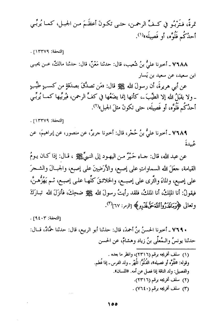7688 - أَخْبَرَنَا عَلِيُّ بْنُ شُعَيْبٍ، قَالَ: حَدَّثَنَا مَعْنٌ، قَالَ: حَدَّثَنَا مَالِكٌ، عَنْ يَحْيَى بْنِ سَعِيدٍ، عَنْ سَعِيدِ بْنِ يَسَارٍ، عَنْ أَبِي هُرَيْرَةَ، أَنَّ رَسُولَ اللهِ صَلَّى اللهُ عَلَيْهِ وَسَلَّمَ قَالَ: «§مَنْ تَصَدَّقَ بِصَدَقَةٍ مِنْ كَسْبٍ طَيِّبٍ، وَلَا يَقْبَلُ اللهُ إِلَّا الطِّيبَ كَأَنَّهَا، إِنَّمَا يَضَعُهَا فِي كَفِّ الرَّحْمَنِ فَيُرَبِّيهَا كَمَا يُرَبِّي أَحَدُكُمْ فَلُوَّهُ أَوْ فَصِيلَهُ حَتَّى تَكُونَ مِثْلَ الْجَبَلِ»