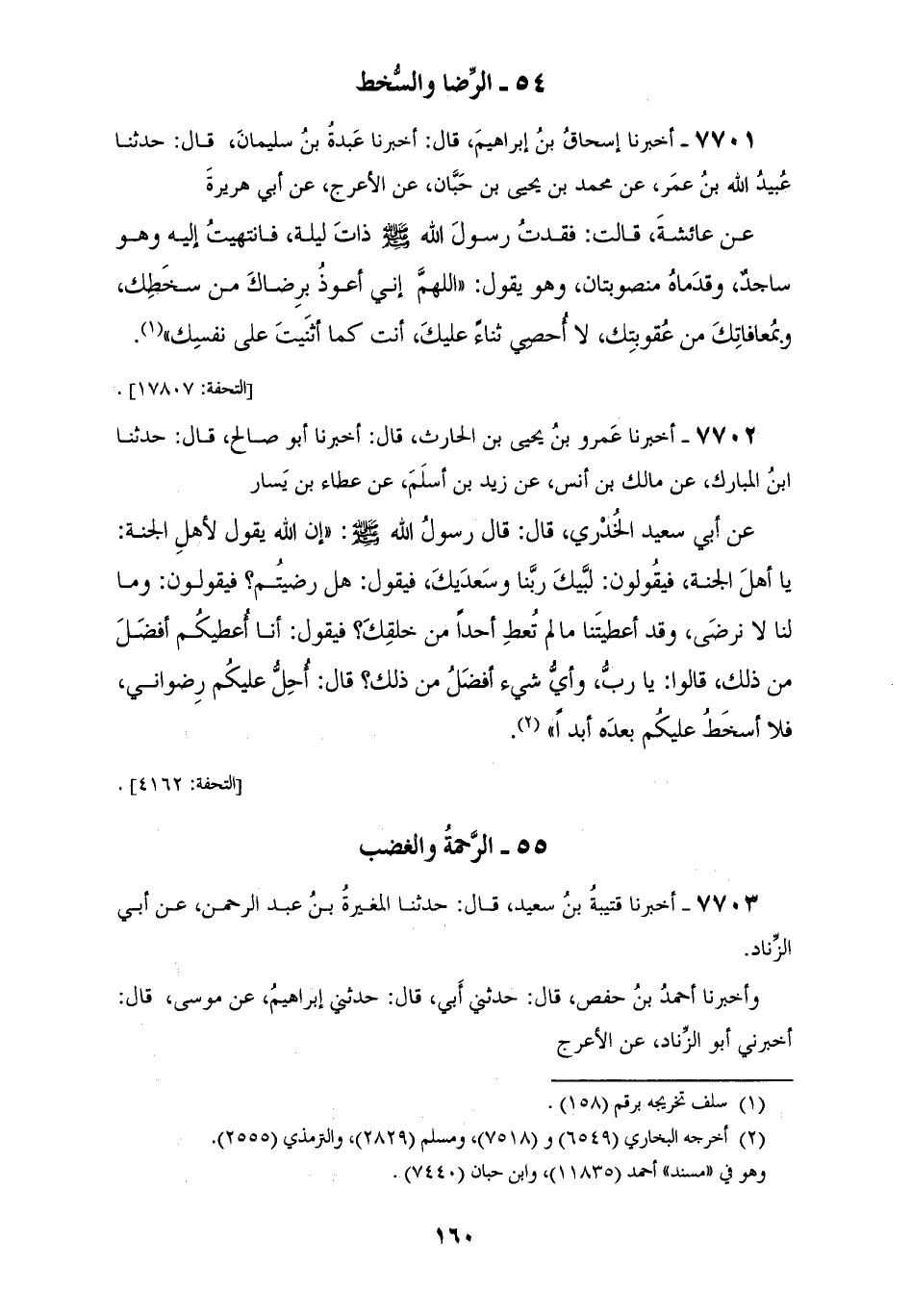 7702 - أَخْبَرَنَا عَمْرُو بْنُ يَحْيَى بْنِ الْحَارِثِ، قَالَ: أَخْبَرَنَا أَبُو صَالِحٍ، قَالَ: حَدَّثَنَا ابْنُ الْمُبَارَكِ، عَنْ مَالِكِ بْنِ أَنَسٍ، عَنْ زَيْدِ بْنِ أَسْلَمَ، عَنْ عَطَاءِ بْنِ يَسَارٍ، عَنْ أَبِي سَعِيدٍ الْخُدْرِيِّ، قَالَ: قَالَ رَسُولُ اللهِ صَلَّى اللهُ عَلَيْهِ وَسَلَّمَ: " §إِنَّ اللهَ يَقُولُ لِأَهْلِ الْجَنَّةِ: يَا أَهْلَ الْجَنَّةِ، فَيَقُولُونَ: لَبَّيْكَ رَبَّنَا وَسَعْدَيْكَ فَيَقُولُ: هَلْ رَضِيتُمْ؟ فَيَقُولُونَ: وَمَا لَنَا لَا نَرْضَى، وَقَدْ أَعْطَيْتَنَا مَا لَمْ تُعْطِ أَحَدًا مِنْ خَلْقِكَ؟ فَيَقُولُ " أَنَا أُعْطِيكُمُ أَفْضَلَ مِنْ ذَلِكَ قَالُوا: يَا رَبِّ، وَأَيُّ شَيْءَ أَفْضَلُ مِنْ ذَلِكَ؟ قَالَ: أُحِلُّ عَلَيْكُمْ رِضْوَانِي فَلَا أَسْخَطُ عَلَيْكُمْ بَعْدَهُ أَبَدًا "