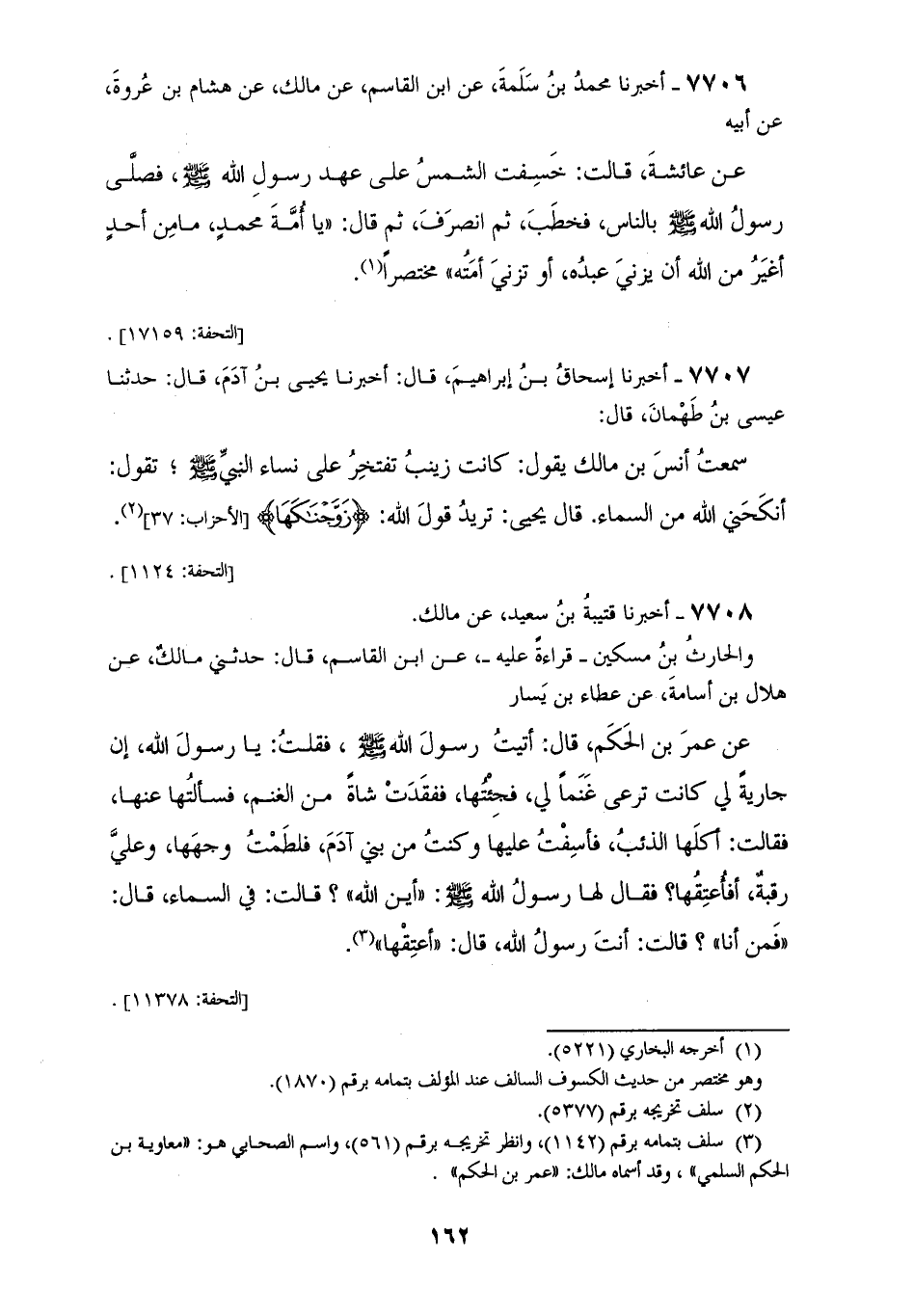 7706 - أَخْبَرَنَا مُحَمَّدُ بْنُ سَلَمَةَ، عَنِ ابْنِ الْقَاسِمِ، عَنْ مَالِكٍ، عَنْ هِشَامِ بْنِ عُرْوَةَ، عَنْ أَبِيهِ، عَنْ عَائِشَةَ، قَالَتْ: خُسِفَتِ الشَّمْسُ عَلَى عَهْدِ رَسُولِ اللهِ صَلَّى اللهُ عَلَيْهِ وَسَلَّمَ فَصَلَّى رَسُولُ اللهِ صَلَّى اللهُ عَلَيْهِ وَسَلَّمَ بِالنَّاسِ فَخَطَبَ ثُمَّ انْصَرَفَ ثُمَّ قَالَ: «§يَا أُمَّةَ مُحَمَّدٍ، مَا مِنْ أَحَدٍ أَغْيَرُ مِنَ اللهِ أَنْ يَزْنِيَ عَبْدُهُ أَوِ تَزْنِيَ أَمَتُهُ مُخْتَصَرًا»
