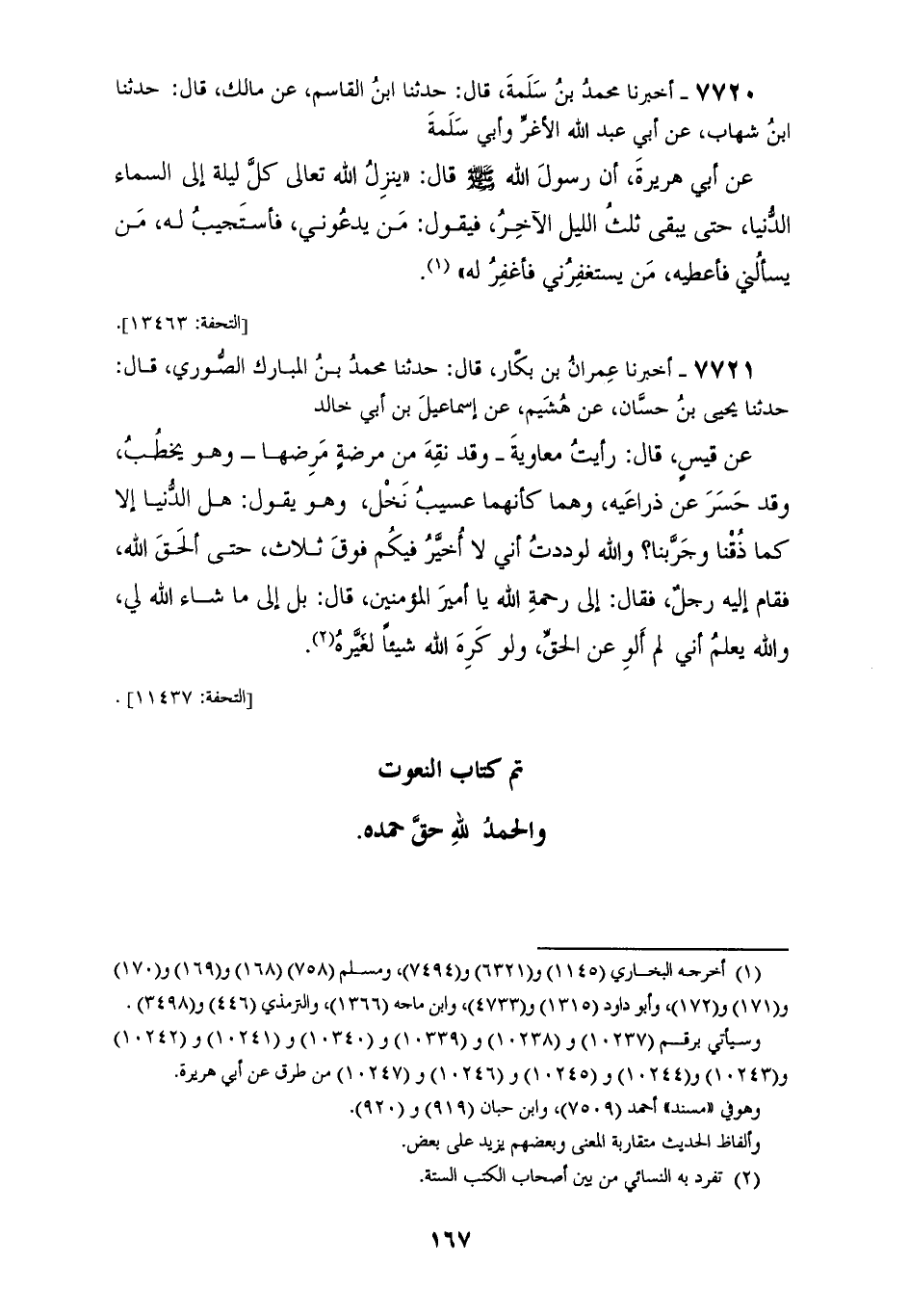 7720 - أَخْبَرَنَا مُحَمَّدُ بْنُ سَلَمَةَ، قَالَ: حَدَّثَنَا ابْنُ الْقَاسِمِ، عَنْ مَالِكٍ، قَالَ: حَدَّثَنَا ابْنُ شِهَابٍ، عَنْ أَبِي عَبْدِ اللهِ الْأَغَرِّ، وَأَبِي سَلَمَةَ، عَنْ أَبِي هُرَيْرَةَ، أَنَّ رَسُولَ اللهِ صَلَّى اللهُ عَلَيْهِ وَسَلَّمَ قَالَ: " §يَنْزِلُ اللهُ تَعَالَى كُلَّ لَيْلَةٍ إِلَى السَّمَاءِ الدُّنْيَا حَتَّى يَبْقَى ثُلُثُ اللَّيْلِ الْأَخِيرُ فَيَقُولُ: مَنْ يَدْعُونِي فَأَسْتَجِيبَ لَهُ مَنْ يَسْأَلُنِي فَأُعْطِيَهُ مَنْ يَسْتَغْفِرُنِي فَأَغْفِرَ لَهُ "
