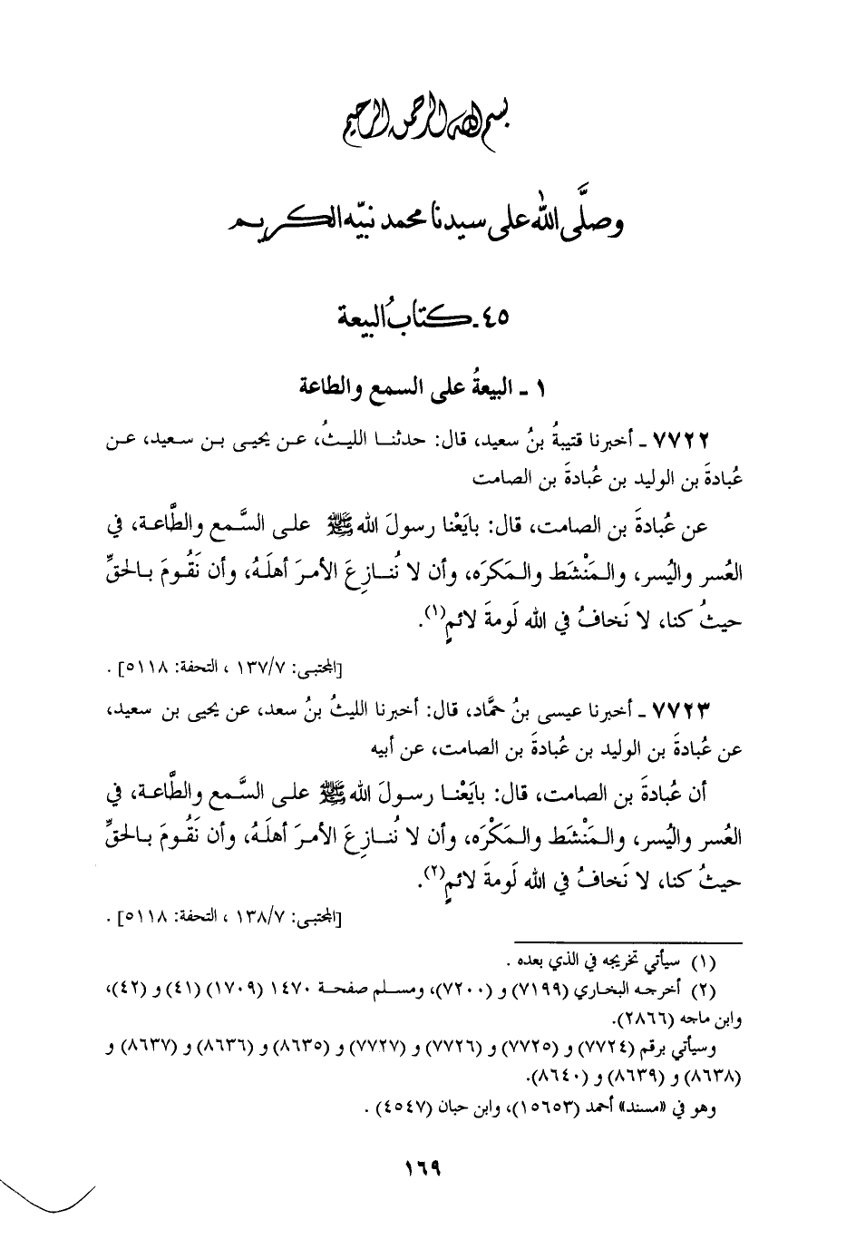 7723 - أَخْبَرَنَا عِيسَى بْنُ حَمَّادٍ، قَالَ: أَخْبَرَنَا اللَّيْثُ بْنُ سَعْدٍ، عَنْ يَحْيَى بْنِ سَعِيدٍ، عَنْ عُبَادَةَ بْنِ الْوَلِيدِ بْنِ عُبَادَةَ بْنِ الصَّامِتِ، عَنْ أَبِيهِ، أَنَّ عُبَادَةَ بْنَ الصَّامِتِ، قَالَ: «بَايَعْنَا رَسُولَ اللهِ صَلَّى اللهُ عَلَيْهِ وَسَلَّمَ §عَلَى السَّمْعِ وَالطَّاعَةِ فِي الْعُسْرِ وَالْيُسْرِ وَالْمَنْشَطِ وَالْمَكْرَهِ، وَأَنْ لَا نُنَازِعَ الْأَمْرَ أَهْلَهُ وَأَنْ نَقُومَ بِالْحَقِّ حَيْثُ كُنَّا لَا نَخَافُ فِي اللهِ لَوْمَةَ لَائِمٍ»