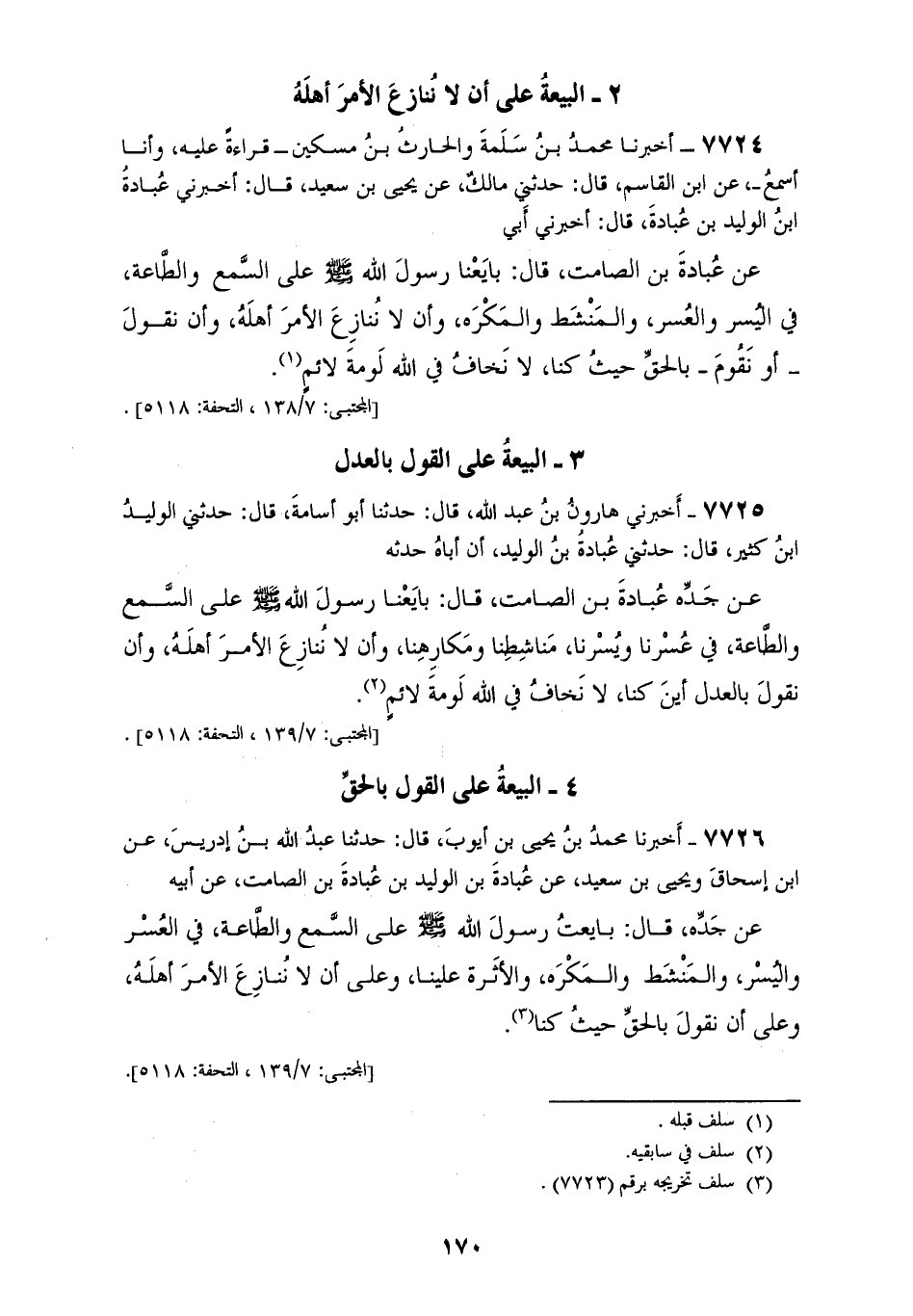7726 - أَخْبَرَنَا مُحَمَّدُ بْنُ يَحْيَى بْنِ أَيُّوبَ، قَالَ: حَدَّثَنَا عَبْدُ اللهِ بْنُ إِدْرِيسَ، عَنِ ابْنِ إِسْحَاقَ، وَيَحْيَى بْنِ سَعِيدٍ، عَنْ عُبَادَةَ بْنِ الْوَلِيدِ بْنِ عُبَادَةَ بْنِ الصَّامِتِ، عَنْ أَبِيهِ، عَنْ جَدِّهِ، قَالَ: «بَايَعْتُ رَسُولَ اللهِ صَلَّى اللهُ عَلَيْهِ وَسَلَّمَ §عَلَى السَّمْعِ وَالطَّاعَةِ فِي الْعُسْرِ وَالْيُسْرِ وَالْمَنْشَطِ وَالْمَكْرَهِ وَالْأَثَرَةِ عَلَيْنَا، وَعَلَى أَنْ لَا نُنَازِعَ الْأَمْرَ أَهْلَهُ، وَعَلَى أَنْ نَقُولَ بِالْحَقِّ حَيْثُ كُنَّا»
