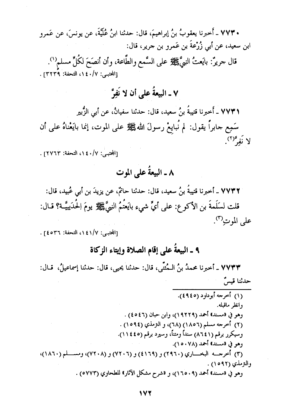 7730 - أَخْبَرَنَا يَعْقُوبُ بْنُ إِبْرَاهِيمَ، قَالَ: حَدَّثَنَا ابْنُ عُلَيَّةَ، عَنْ يُونُسَ، عَنْ عَمْرِو بْنِ سَعِيدٍ، عَنْ أَبِي زُرْعَةَ بْنِ عَمْرِو بْنِ جَرِيرٍ، قَالَ: قَالَ جَرِيرٌ: «بَايَعْتُ النَّبِيَّ صَلَّى اللهُ عَلَيْهِ وَسَلَّمَ §عَلَى السَّمْعِ وَالطَّاعَةِ وَأَنْ أَنْصَحَ لِكُلِّ مُسْلِمٍ»
