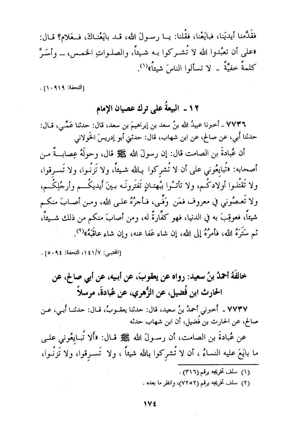 7736 - أَخْبَرَنَا عُبَيْدُ اللهِ بْنُ سَعْدِ بْنِ إِبْرَاهِيمَ بْنِ سَعْدٍ، قَالَ: حَدَّثَنَا عَمِّي، قَالَ: حَدَّثَنَا أَبِي، عَنْ صَالِحٍ، عَنِ ابْنِ شِهَابٍ، قَالَ: حَدَّثَنِي أَبُو إِدْرِيسَ الْخَوْلَانِيُّ، أَنَّ عُبَادَةَ بْنَ الصَّامِتِ، قَالَ: إِنَّ رَسُولَ اللهِ صَلَّى اللهُ عَلَيْهِ وَسَلَّمَ قَالَ وَحَوْلَهُ عِصَابَةٌ مِنْ أَصْحَابِهِ: «§تُبَايِعُونِي عَلَى أَنْ لَا تُشْرِكُوا بِاللهِ شَيْئًا، وَلَا تَزْنُوا، وَلَا تَسْرِقُوا، وَلَا تَقْتُلُوا أَوْلَادَكُمْ، وَلَا تَأْتَوا بِبُهْتَانٍ تَفْتَرُونَهُ بَيْنَ أَيْدِيكُمْ وَأَرْجُلِكُمْ وَلَا تَعْصُونِي فِي مَعْرُوفٍ، فَمَنْ وَفَّى فَأَجْرُهُ عَلَى اللهِ وَمَنْ أَصَابَ مِنْكُمْ شَيْئًا فَعُوقِبَ بِهِ فِي الدُّنْيَا فَهُوَ كَفَّارَةٌ لَهُ وَمَنْ أَصَابَ مِنْكُمْ مِنْ ذَلِكَ شَيْئًا ثُمَّ سَتَرَهُ اللهُ، فَأَمْرُهُ إِلَى اللهِ إِنْ شَاءَ عَفَا عَنْهُ وَإِنْ شَاءَ عَاقَبَهُ» خَالَفَهُ أَحْمَدُ بْنُ سَعِيدٍ. رَوَاهُ عَنْ يَعْقُوبَ، عَنْ أَبِيهِ، عَنْ صَالِحٍ، عَنِ الْحَارِثِ بْنِ فُضَيْلٍ، عَنْ الزُّهْرِيِّ، عَنْ عُبَادَةَ مُرْسَلًا
