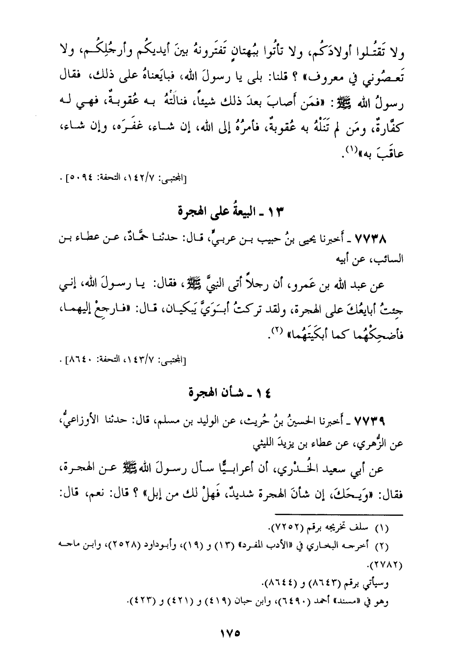 7737 - أَخْبَرَنِي أَحْمَدُ بْنُ سَعِيدٍ، قَالَ: حَدَّثَنَا يَعْقُوبُ، قَالَ: حَدَّثَنَا أَبِي، عَنْ صَالِحٍ، عَنِ الْحَارِثِ بْنِ فُضَيْلٍ، أَنَّ ابْنَ شِهَابٍ، حَدَّثَهُ عَنْ عُبَادَةَ بْنِ الصَّامِتِ، أَنَّ رَسُولَ اللهِ صَلَّى اللهُ عَلَيْهِ وَسَلَّمَ قَالَ: " §أَلَا تُبَايِعُونِي عَلَى مَا بَايَعَ عَلَيْهِ النِّسَاءُ، أَنْ لَا تُشْرِكُوا بِاللهِ شَيْئًا وَلَا تَسْرِقُوا وَلَا تَزْنُوا وَلَا تَقْتُلُوا أَوْلَادَكُمْ، وَلَا تَأْتُوا بِبُهْتَانٍ تَفْتَرُونَهُ بَيْنَ أَيْدِيكُمْ وَأَرْجُلِكُمْ وَلَا تَعْصُونِي فِي مَعْرُوفٍ؟ قُلْنَا: بَلَى يَا رَسُولَ اللهِ، فَبَايَعْنَاهُ عَلَى ذَلِكَ فَقَالَ رَسُولُ اللهِ صَلَّى اللهُ عَلَيْهِ وَسَلَّمَ: «فَمَنْ أَصَابَ بَعْدَ ذَلِكَ شَيْئًا فَنَالَتْهُ بِهِ عُقُوبَةٌ فَهِي لَهُ كَفَّارَةٌ وَمَنْ لَمْ تَنَلْهُ بِهِ عُقُوبَةٌ فَأَمْرُهُ إِلَى اللهِ إِنْ شَاءَ غَفَرَهُ وَإِنْ شَاءَ عَاقَبَ بِهِ»