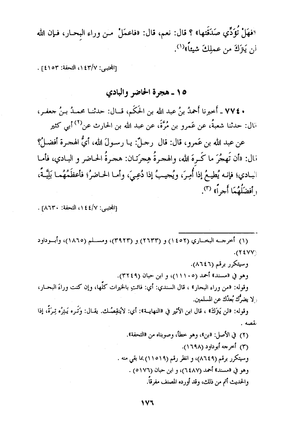 7740 - أَخْبَرَنَا أَحْمَدُ بْنُ عَبْدِ اللهِ بْنِ الْحَكَمِ، قَالَ: حَدَّثَنَا مُحَمَّدُ بْنُ جَعْفَرٍ، قَالَ: حَدَّثَنَا شُعْبَةُ، عَنْ عَمْرِو بْنِ مُرَّةَ، عَنْ عَبْدِ اللهِ بْنِ الْحَارِثِ، عَنْ أَبِي كَثِيرٍ، عَنْ عَبْدِ اللهِ بْنِ عَمْرٍو، قَالَ: قَالَ رَجُلٌ: يَا رَسُولَ اللهِ، أَيُّ الْهِجْرَةِ أَفْضَلُ؟ قَالَ: «§أَنْ تُهْجُرَ مَا كَرِهَ اللهُ وَالْهِجْرَةُ هِجْرَتَانِ هِجْرَةُ الْحَاضِرِ وَالْبَادِي فَأَمَّا الْبَادِي فَإِنَّهُ يُطِيعُ إِذَا أُمِرَ وَيُجِيبُ إِذَا دُعِيَ وَأَمَّا الْحَاضِرُ فَأَعْظَمُهُمَا بَلِيَّةً وَأَفْضَلُهُمَا أَجْرًا»