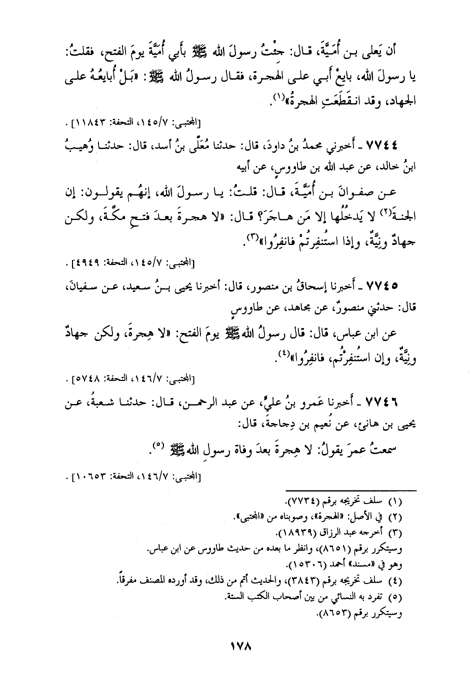 7744 - أَخْبَرَنِي مُحَمَّدُ بْنُ دَاوُدَ، قَالَ: حَدَّثَنَا مُعَلَّى بْنُ أَسَدٍ، قَالَ: حَدَّثَنَا وُهَيْبُ بْنُ خَالِدٍ، عَنْ عَبْدِ اللهِ بْنِ طَاوُسٍ، عَنْ أَبِيهِ، عَنْ صَفْوَانَ بْنِ أُمَيَّةَ، قَالَ قُلْتُ: يَا رَسُولَ اللهِ، إِنَّهُمْ يَقُولُونَ: إِنَّ الْجَنَّةَ لَا يَدْخُلُهَا إِلَّا مَنْ هَاجَرَ، قَالَ: «§لَا هِجْرَةَ بَعْدَ فَتْحِ مَكَّةَ وَلَكِنْ جِهَادٌ وَنِيَّةٌ، وَإِذَا اسْتُنْفِرْتُمْ فَانْفِرُوا»