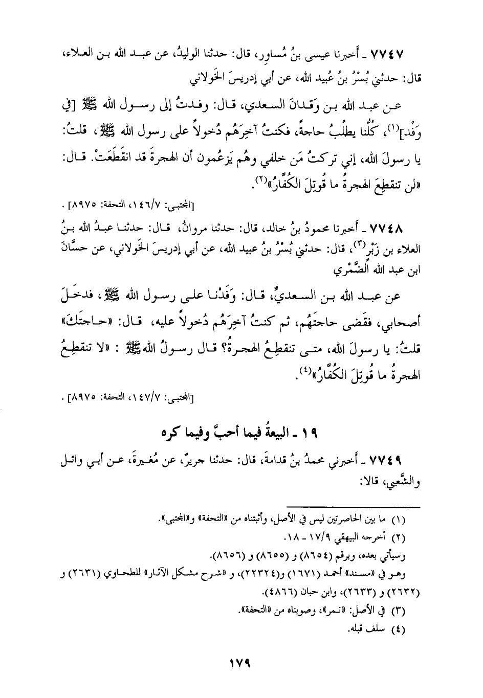 7748 - أَخْبَرَنَا مَحْمُودُ بْنُ خَالِدٍ، قَالَ: حَدَّثَنَا مَرْوَانُ، قَالَ: حَدَّثَنَا عَبْدُ اللهِ بْنُ الْعَلَاءِ بْنِ زَبْرٍ، قَالَ: حَدَّثَنِي بُسْرُ بْنُ عُبَيْدِ اللهِ، عَنْ أَبِي إِدْرِيسَ الْخَوْلَانِيِّ، عَنْ حَسَّانَ بْنِ عَبْدِ اللهِ الضَّمْرِيِّ، عَنْ عَبْدِ اللهِ بْنِ السَّعْدِيِّ، قَالَ: وَفَدْنَا عَلَى رَسُولِ اللهِ صَلَّى اللهُ عَلَيْهِ وَسَلَّمَ فَدَخَلَ أَصْحَابِي فَقَضَى حَاجَتَهُمْ، ثُمَّ كُنْتُ آخِرَهُمْ دُخُولًا عَلَيْهِ قَالَ: «حَاجَتَكَ» قُلْتُ: يَا رَسُولَ اللهِ، مَتَى تَنْقَطِعُ الْهِجْرَةُ؟ قَالَ رَسُولُ اللهِ صَلَّى اللهُ عَلَيْهِ وَسَلَّمَ: «§لَا تَنْقَطِعُ الْهِجْرَةُ مَا قُوتِلَ الْكُفَّارُ»