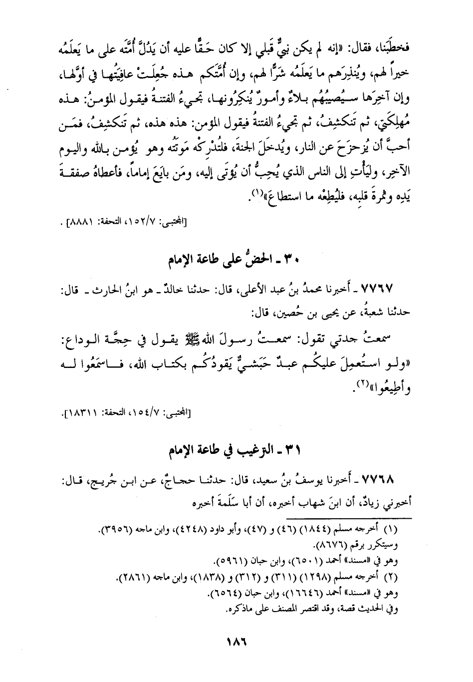 7766 - أَخْبَرَنَا هَنَّادُ بْنُ السَّرِيِّ، عَنْ أَبِي مُعَاوِيَةَ، عَنِ الْأَعْمَشِ، عَنْ زَيْدِ بْنِ وَهْبٍ، عَنْ عَبْدِ الرَّحْمَنِ بْنِ عَبْدِ رَبِّ الْكَعْبَةِ، قَالَ: انْتَهَيْتُ إِلَى عَبْدِ اللهِ بْنِ عَمْرٍو وَهُوَ جَالِسٌ فِي ظِلِّ الْكَعْبَةِ وَالنَّاسُ مُجْتَمِعُونَ فَسَمِعْتُهُ يَقُولُ: بَيْنَا نَحْنُ مَعَ رَسُولِ اللهِ صَلَّى اللهُ عَلَيْهِ وَسَلَّمَ فِي سَفَرٍ إِذْ نَزَلْنَا مَنْزِلًا فَمِنَّا مَنْ يَضْرِبُ خِبَاءَهُ إِذْ نَادَى مُنَادِيهِ الصَّلَاةَ جَامِعَةً فَاجْتَمَعْنَا فَقَامَ رَسُولُ اللهِ صَلَّى اللهُ عَلَيْهِ وَسَلَّمَ فَخَطَبَنَا فَقَالَ: " §إِنَّهُ لَمْ يَكُنْ نَبِيٌّ قَبْلِي إِلَّا كَانَ حَقًّا عَلَيْهِ أَنْ يَدُلَّ أَمَّتَهُ عَلَى مَا يَعْلَمُهُ خَيْرًا لَهُمْ، وَيُنْذِرَهُمْ مَا يَعْلَمُهُ شَرًّا لَهُمْ، وَإِنَّ أُمَّتُكُمْ هَذِهِ جُعِلَتْ عَافِيَتُهَا فِي أَوَّلِهَا، وَإِنَّ آخِرَهَا سَيُصِيبُهُمْ بَلَاءٌ وَأُمُورٌ يُنْكِرُونَهَا، تَجِيءُ الْفِتْنَةُ فَيَقُولُ الْمُؤْمِنُ: هَذِهِ مُهْلِكَتِي، ثُمَّ تَنْكَشِفُ، ثُمَّ تَجِيءُ الْفِتْنَةُ فَيَقُولُ الْمُؤْمِنُ: هَذِهِ هَذِهِ، ثُمَّ تَنْكَشِفُ، فَمَنْ أَحَبَّ أَنْ يُزَحْزَحَ عَنِ النَّارِ وَيَدْخُلَ الْجَنَّةَ فَلْتُدْرِكْهُ مَوْتَتُهُ وَهُوَ يُؤْمِنُ بِاللهِ وَالْيَوْمِ الْآخِرِ، وَلْيَأْتِ إِلَى النَّاسِ الَّذِي يُحِبُّ أَنْ يُؤْتَى إِلَيْهِ، وَمَنْ بَايَعَ إِمَامًا فَأَعْطَاهُ صَفْقَةَ يَدِهِ وَثَمَرَةَ قَلْبِهِ فَلْيُطِعْهُ مَا اسْتَطَاعَ