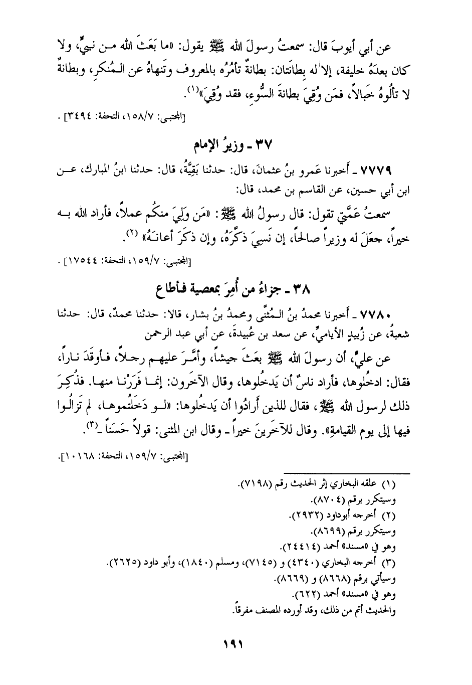 7780 - أَخْبَرَنَا مُحَمَّدُ بْنُ الْمُثَنَّى، وَمُحَمَّدُ بْنُ بَشَّارٍ، قَالَا: حَدَّثَنَا مُحَمَّدٌ، قَالَ: حَدَّثَنَا شُعْبَةُ، عَنْ زُبَيْدٍ الْأَيَامِيِّ، عَنْ سَعْدِ بْنِ عُبَيْدَةَ، عَنْ أَبِي عَبْدِ الرَّحْمَنِ، عَنْ عَلِيٍّ، أَنَّ رَسُولَ اللهِ صَلَّى اللهُ عَلَيْهِ وَسَلَّمَ بَعَثَ جَيْشًا، وَأَمَّرَ عَلَيْهِمْ رَجُلًا فَأَوْقَدَ نَارًا، فَقَالَ: ادْخُلُوهَا فَأَرَادَ نَاسٌ أَنْ يَدْخُلُوهَا وَقَالَ الْآخَرُونَ: إِنَّمَا فَرَرْنَا مِنْهَا فَذَكَرَ ذَلِكَ لِرَسُولِ اللهِ صَلَّى اللهُ عَلَيْهِ وَسَلَّمَ، فَقَالَ لِلَّذِينَ أَرَادُوا أَنْ يَدْخُلُوهَا: «§لَوْ دَخَلْتُمُوهَا لَمْ تَزَالُوا فِيهَا إِلَى يَوْمِ الْقِيَامَةِ» وَقَالَ لِلْآخَرِينَ خَيْرًا. وَقَالَ ابْنُ الْمُثَنَّى قَوْلًا حَسَنًا "