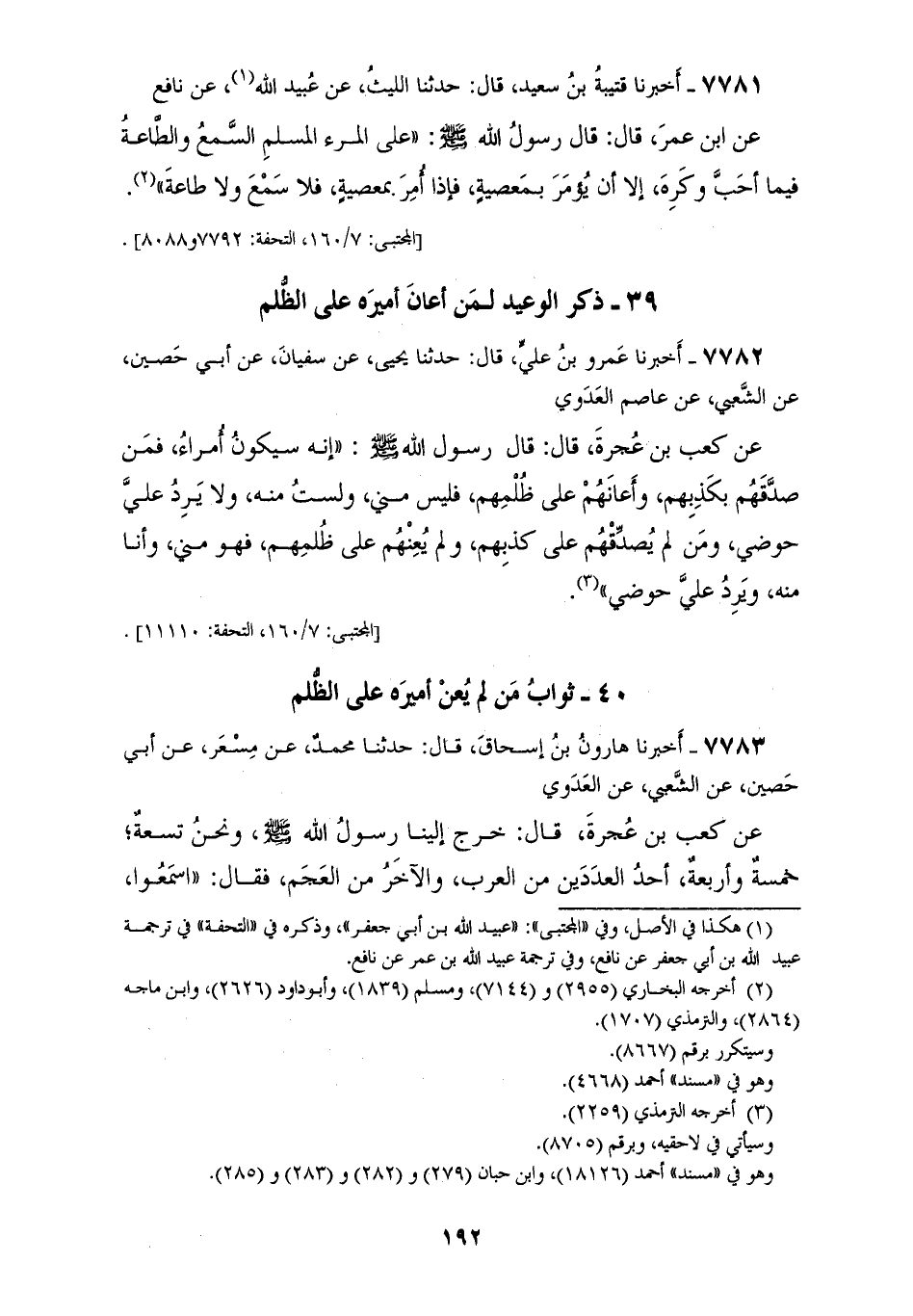 7782 - أَخْبَرَنَا عَمْرُو بْنُ عَلِيٍّ، قَالَ: حَدَّثَنَا يَحْيَى، عَنْ سُفْيَانَ، عَنْ أَبِي حُصَيْنٍ، عَنِ الشَّعْبِيِّ، عَنْ عَاصِمٍ الْعَدَوِيِّ، عَنْ كَعْبِ بْنِ عُجْرَةَ، قَالَ: قَالَ رَسُولُ اللهِ صَلَّى اللهُ عَلَيْهِ وَسَلَّمَ: «§إِنَّهُ سَيَكُونُ أُمَرَاءُ فَمَنْ صَدَّقَهُمْ بِكَذِبِهِمْ وَأَعَانَهُمْ عَلَى ظُلْمِهِمْ فَلَيْسَ مِنِّي، وَلَسْتُ مِنْهُ، وَلَا يَرِدُ عَلَيَّ حَوْضِي، وَمَنْ لَمْ يُصَدِّقْهُمْ عَلَى كَذِبِهِمْ، وَلَمْ يُعِنْهُمْ عَلَى ظُلْمِهِمْ، فَهُوَ مِنِّي وَأَنَا مِنْهُ وَيَرِدُ عَلَيَّ حَوْضِي»