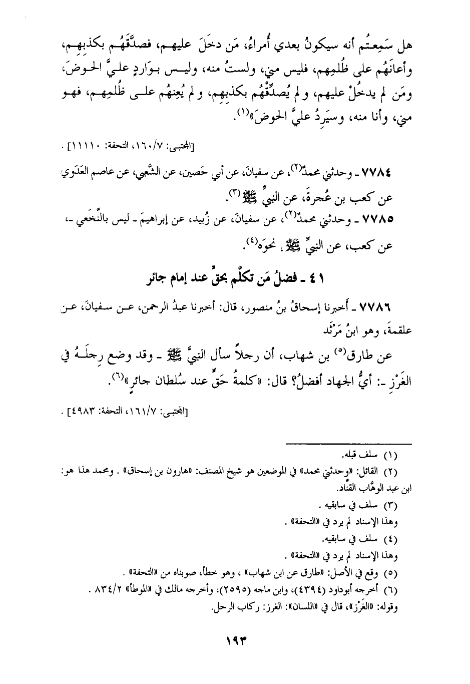 7783 - أَخْبَرَنَا هَارُونُ بْنُ إِسْحَاقَ، قَالَ: حَدَّثَنَا مُحَمَّدٌ عَنْ مِسْعَرٌ، عَنْ أَبِي حُصَيْنٍ، عَنِ الشَّعْبِيِّ، عَنْ الْعَدَوِيِّ، عَنْ كَعْبِ بْنِ عُجْرَةَ، قَالَ: خَرَجَ إِلَيْنَا رَسُولُ اللهِ صَلَّى اللهُ عَلَيْهِ وَسَلَّمَ وَنَحْنُ تِسْعَةٌ خَمْسَةٌ وَأَرْبَعَةٌ أَحَدُ الْعَدَدَيْنِ مِنَ الْعَرَبِ، وَالْآخَرُ مِنَ الْعَجَمِ، فَقَالَ: «§اسْمَعُوا هَلْ سَمِعْتُمْ أَنَّهُ سَيَكُونُ بَعْدِي أُمَرَاءُ مَنْ دَخَلَ عَلَيْهِمْ فَصَدَّقَهُمْ بِكَذِبِهِمْ وَأَعَانَهُمْ عَلَى ظُلْمِهِمْ، فَلَيْسَ مِنِّي، وَلَسْتُ مِنْهُ، وَلَيْسَ بِوَارِدٍ عَلَيَّ الْحَوْضَ، وَمَنْ لَمْ يَدْخُلْ عَلَيْهِمْ وَلَمْ يُصَدِّقْهُمْ بِكَذِبِهِمْ وَلَمْ يُعِنْهُمْ عَلَى ظُلْمِهِمْ، فَهُوَ مِنِّي، وَأَنَا مِنْهُ وَسَيَرِدُ عَلَيَّ الْحَوْضَ»