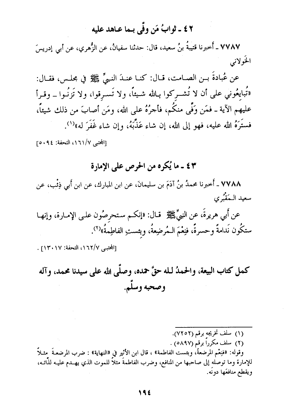 7787 - أَخْبَرَنَا قُتَيْبَةُ بْنُ سَعِيدٍ، قَالَ: حَدَّثَنَا سُفْيَانُ، عَنِ الزُّهْرِيِّ، عَنْ أَبِي إِدْرِيسَ الْخَوْلَانِيِّ، عَنْ عُبَادَةَ بْنِ الصَّامِتِ، قَالَ: كُنَّا عِنْدَ النَّبِيِّ صَلَّى اللهُ عَلَيْهِ وَسَلَّمَ فِي مَجْلِسٍ فَقَالَ: «§تُبَايِعُونِي عَلَى أَنْ لَا تُشْرِكُوا بِاللهِ شَيْئًا، وَلَا تَسْرِقُوا، وَلَا تَزْنُوا» وَقَرَأَ عَلَيْهِمُ الْآيَةَ «فَمَنْ وَفَّى مِنْكُمْ فَأَجْرُهُ عَلَى اللهِ وَمَنْ أَصَابَ مِنْ ذَلِكَ شَيْئًا فَسَتَرَهُ اللهُ عَلَيْهِ فَهُوَ إِلَى اللهِ إِنْ شَاءَ عَذَّبَهُ وَإِنْ شَاءَ غَفَرَ لَهُ»