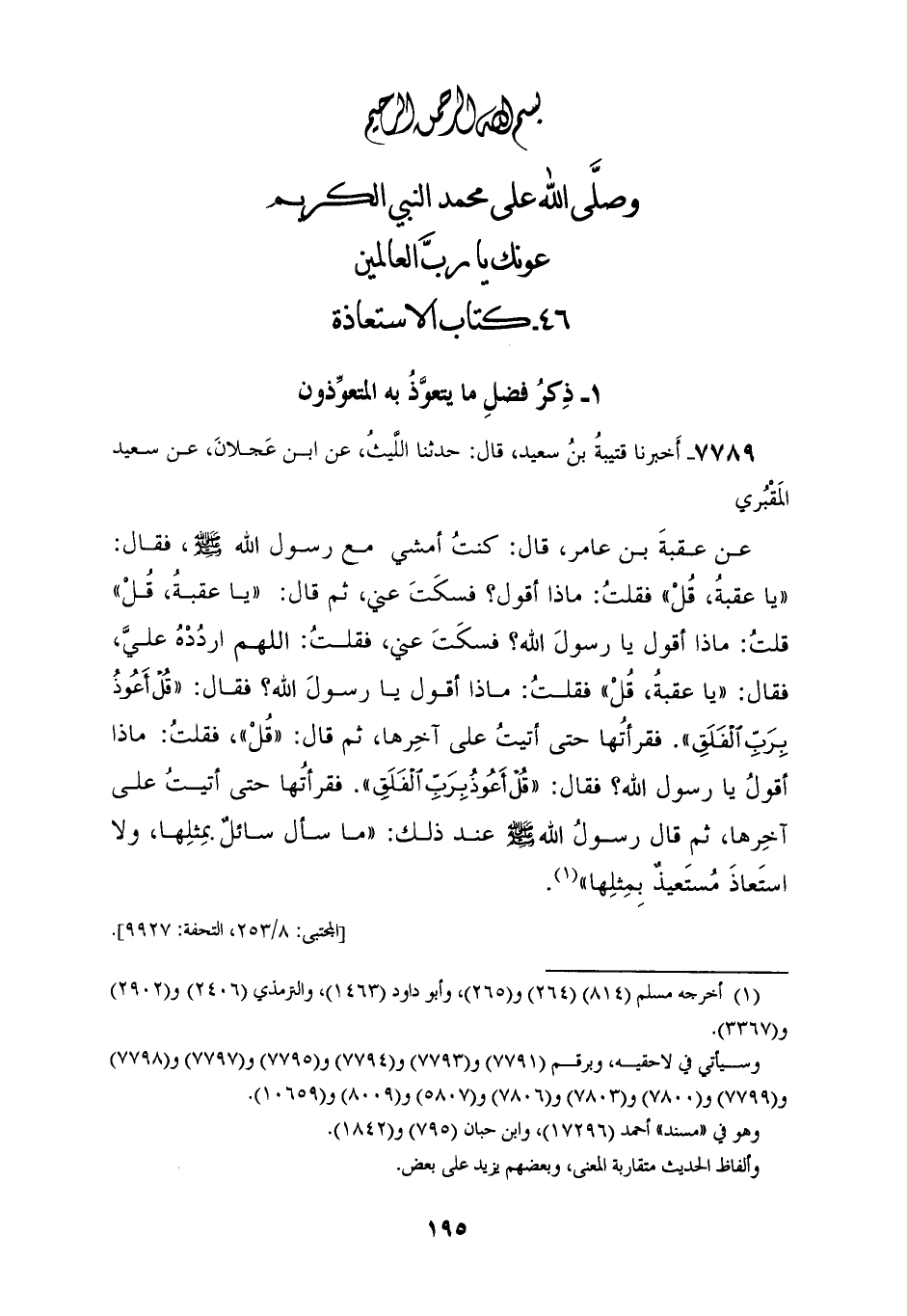 7789 - أَخْبَرَنَا قُتَيْبَةُ بْنُ سَعِيدٍ، قَالَ: حَدَّثَنَا اللَّيْثُ، عَنِ ابْنِ عَجْلَانَ، عَنْ سَعِيدٍ الْمَقْبُرِيِّ، عَنْ عُقْبَةَ بْنِ عَامِرٍ، قَالَ: كُنْتُ أَمْشِي مَعَ رَسُولِ اللهِ صَلَّى اللهُ عَلَيْهِ وَسَلَّمَ فَقَالَ: «يَا عُقْبَةُ، قُلْ» فَقُلْتُ: مَاذَا أَقُولُ؟ فَسَكَتَ عَنِّي، ثُمَّ قَالَ: «يَا عُقْبَةُ قُلْ» قُلْتُ: مَاذَا أَقُولُ يَا رَسُولَ اللهِ؟ فَسَكَتَ عَنِّي، فَقُلْتُ: اللهُمَّ ارْدُدْهُ عَلَيَّ فَقَالَ: «يَا عُقْبَةُ قُلْ» فَقُلْتَ: مَاذَا أَقُولُ يَا رَسُولَ اللهِ؟ فَقَالَ: «§قُلْ أَعُوذُ بِرَبِّ الْفَلَقِ» فَقَرَأْتُهَا حَتَّى أَتَيْتُ عَلَى آخِرِهَا، ثُمَّ قَالَ: «قُلْ» فَقُلْتُ: مَاذَا أَقُولُ يَا رَسُولَ اللهِ؟ فَقَالَ: «قُلْ أَعُوذُ بِرَبِّ الفَلَقِ» فَقَرَأْتُهَا حَتَّى أَتَيْتُ عَلَى آخِرِهَا، ثُمَّ قَالَ رَسُولُ اللهِ صَلَّى اللهُ عَلَيْهِ وَسَلَّمَ عِنْدَ ذَلِكَ: «مَا سَأَلَ سَائِلٌ بِمِثْلِهَا، وَلَا اسْتَعَاذَ مُسْتَعِيذٌ بِمِثْلِهَا»