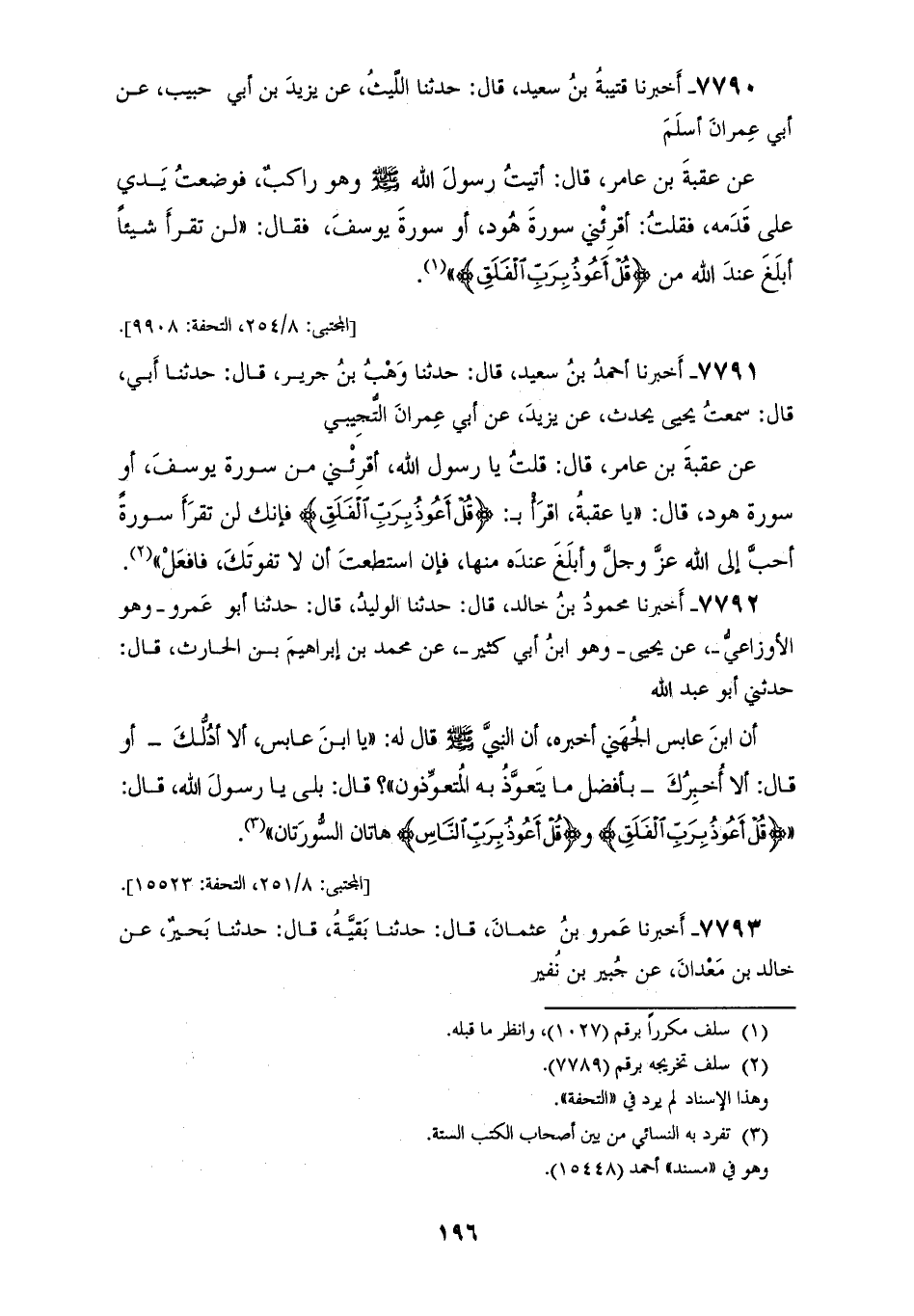 7790 - أَخْبَرَنَا قُتَيْبَةُ بْنُ سَعِيدٍ، قَالَ: حَدَّثَنَا اللَّيْثُ، عَنْ يَزِيدَ بْنِ أَبِي حَبِيبٍ، عَنْ أَبِي عِمْرَانَ أَسْلَمَ، عَنْ عُقْبَةَ بْنِ عَامِرٍ، قَالَ: أَتَيْتُ رَسُولَ اللهِ صَلَّى اللهُ عَلَيْهِ وَسَلَّمَ وَهُوَ رَاكِبٌ فَوَضَعْتُ يَدَيَّ عَلَى قَدَمِهِ فَقُلْتُ: أَقْرِئْنِي سُورَةَ هُودٍ أَوْ سُورَةَ يُوسُفَ، فَقَالَ: «§لَنْ تَقْرَأَ شَيْئًا أَبْلَغَ عِنْدَ اللهِ مِنْ قُلْ أَعُوذُ بِرَبِّ الْفَلَقِ»